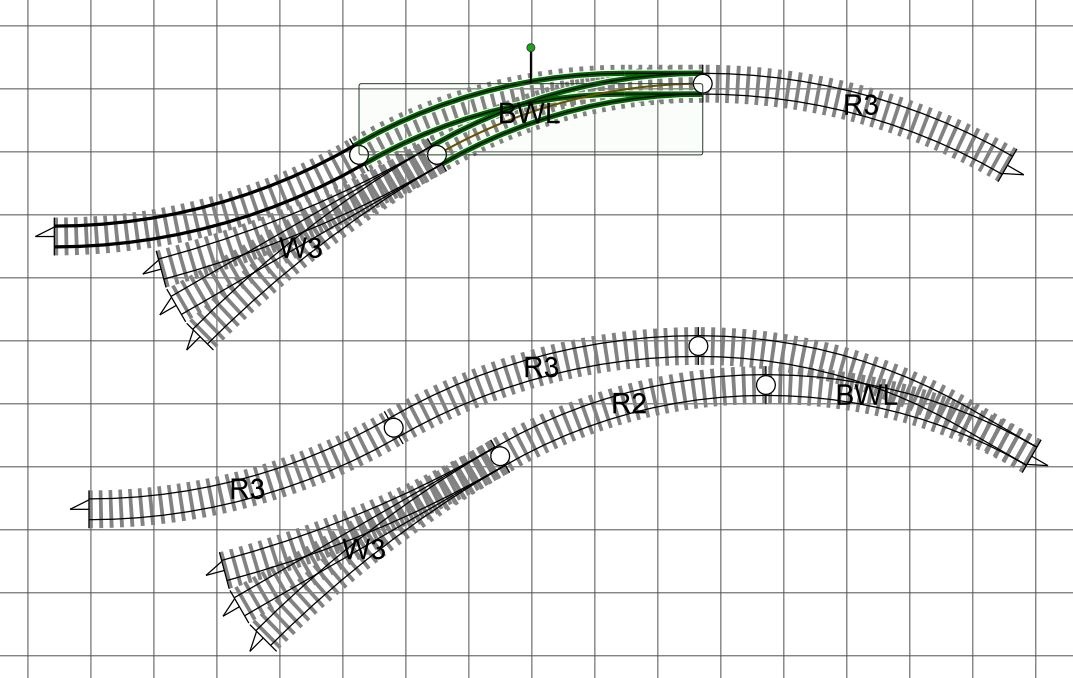 A zöld jelemnél: az R3-as és a hármas kitérő, valósában összeérnek, sőt emiatt váltani se lehet. Alábbi képen látható, hogyan lehetne korrigálni.  |
