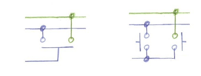 Úgy kell csinálni, hogy a rajzon a kék vezeték a kapcsolópult egyik nyomógombja, a zöld vezeték meg a másik.