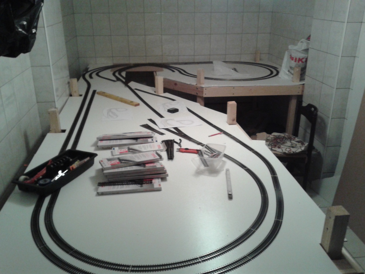 A képen az alsó szint pályája. Jelenleg csak egy bútorhátlap az ideiglenes alap. Azért keztem így összeállítani a pályát, hogy a végleges nyomvonalat még a fixálások előtt láthassam (így egyben nem is gondoltam volna milyen eltérések jelentkeztek). Az összeállított nyomvonal alá fogom következő lépésként a végleges alépítményt kivágni.