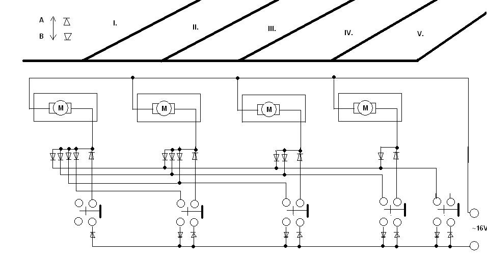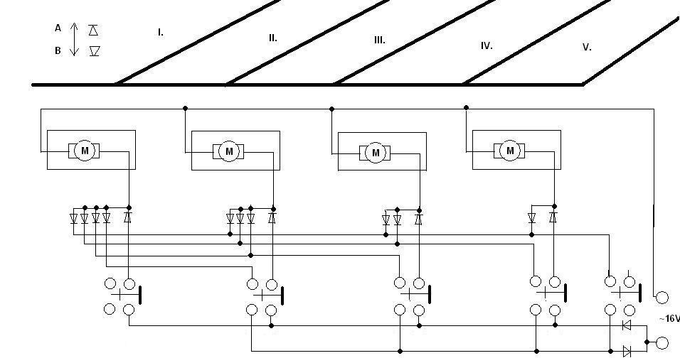 Pontosan. A trafo also vezetékét fel kell osztani 2 diodával + -ra meg - ra. Igy kapsz két vezetéket az egyiket a nyomogombok egyik körére a másikat a másik felére kell kötni, majd innen egyenesen vagy diodákon át ( ha több váltóra kell vinni a potenciált) alakithatod a váltók kapcsolását. A diodák száma valamivel csökken a korábbi változathoz képest, a logika viszont marad, egymástól el lesz választva a két polus és nem kerül sor a motorok párhuzamos kapcsolására mind a korábbi rajzomban.