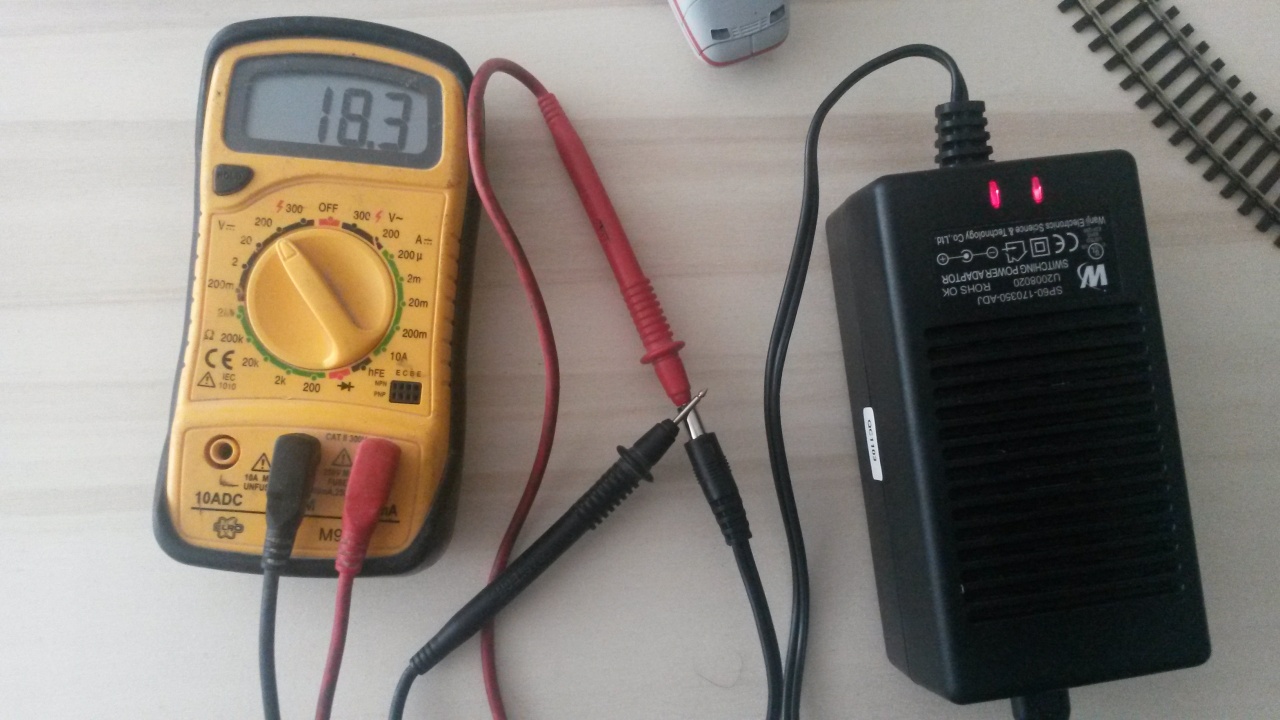 Az ESU-nak külső tápja van, a képen ez látható. Van rajta egy potméter, amivel állítható a kimenő feszültsége 15V-21V-ig. Ha a Táp 18.3V-ra van állítva, akkor a központból 16.9V megy ki a sínekre. Kondi és dióda nélkül (váltóáramon mérve), mert az nincs itthon.