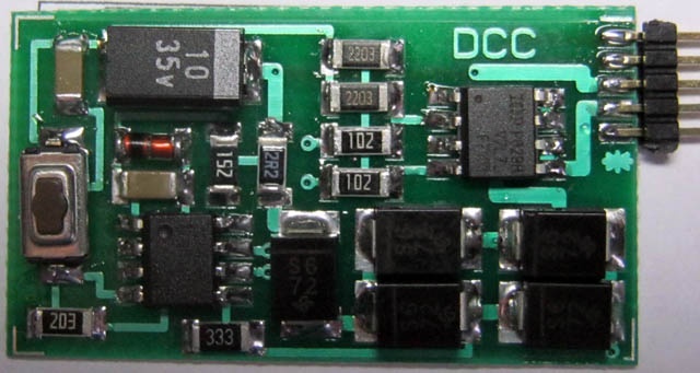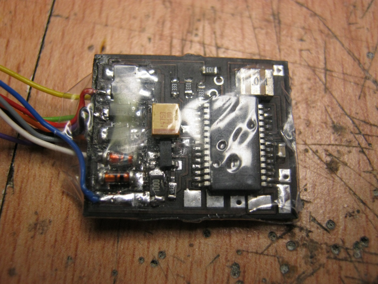 Most kerül be egy Kleibahn 5147-es motorvonatba, ami kétmotoros. Majd fotózom is, a dekóder olyan, amilyen. Kicsit igénytelen a kivitelezése, a sínre helyezéskor az első pillanatban olyan 2-300mA az áramfelvétele, mert a belső pufferén a bekapcsolási áramfelvétel nincs korlátozva. A motorszabályzó szoftvere nem a legjobb, sőt, a kimondottan gyengék közül való, ennél azért sokkal jobbak vannak már. De provizórikusan már szórakoztam vele, kis macerával azért meg lehet tanítani arra, hogy szerényen viselkedjen egy úri társaságban, ne óbégasson, ne a markába fújja az orrát, és ne szürcsölve igya a teát.  |