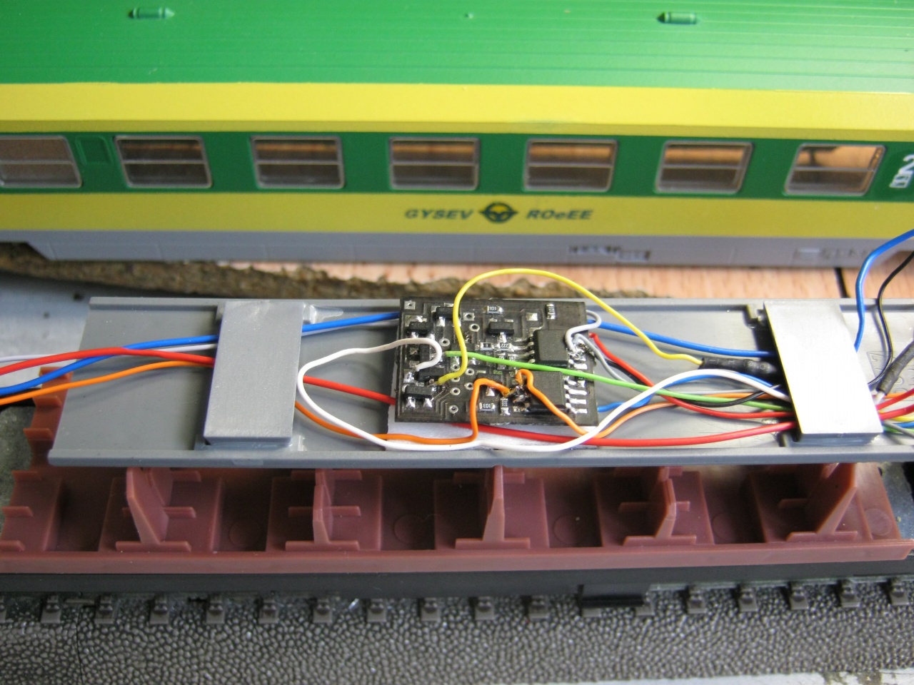 A harmadik képen egy Kleinbahn GYSEV 5147 motoros részébe van beépítve immár. Miután helyrerángattam a dekódert, gyári állapotban is eléggé szépen viszi a kétmotoros modellt. Ugyan az irányváltásra még egy kicsit modortalanul reagál, de már eléggé szépen mozgatja a motorkocsit.