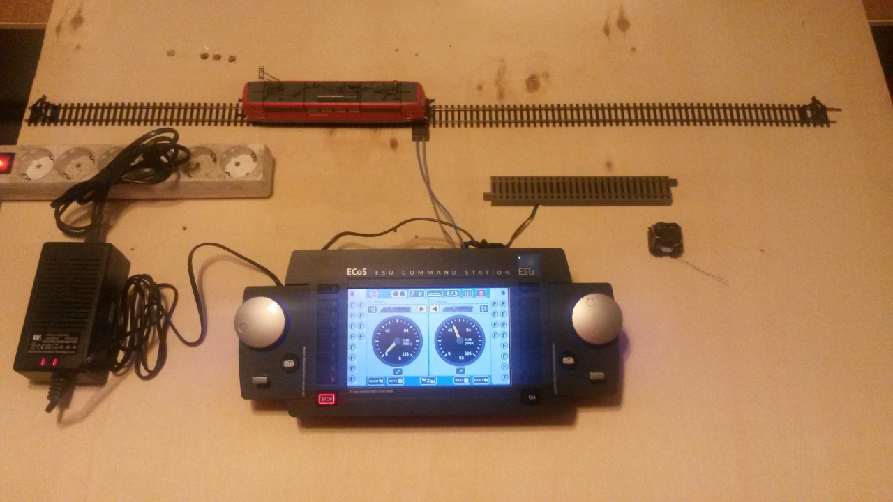Itt egy kép a tesztasztalról. Mit lehet ezen elszúrni? A mozdonyok újak voltak amibe raktam a dekódereket. Más dekóderrel mennek gond nélkül. A dekóder is új volt mind. Max fordítva rakhatom be, de nem tettem és az se indokolná a leégést. Csak a központ lehetett a ludas, más nem maradt. Úgy kaptam vissza, hogy semmi baja, mégis 60mp elég volt nekem a hiba rekonstrukciójához.