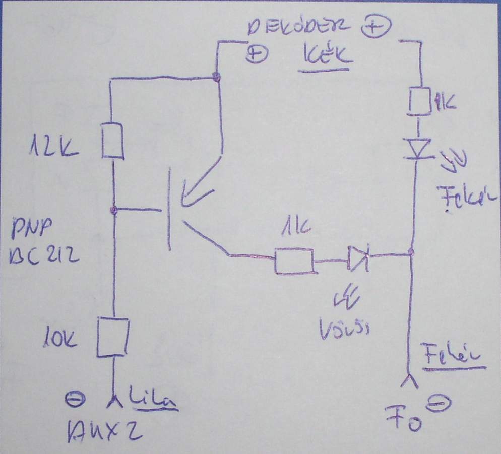Egy szépséghibája van, hogy ha a az AUX2 nem aktív, akkor is "dereng" a piros LED. 12V-nál semmi, viszont 18V-nál már picit dereng, de alig látható a vörös, a fehér semmit sem világít. Mi lehet az oka? A 12K-s ellenállásra alábbhagyott a derengés, de hiába emeltem feljebb ez a minimális derengés megmaradt... Lehet lejjebb kellett volna vinni az értéket???