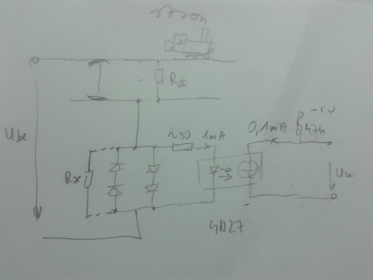 S most jön a turpisság, ezt az alig 1 Voltot ( feszültséget!!!! ) - a te esetedben inkább 1,5V, kell a következö fokozatnak bizonyos beállithato határok között érzékelnie, mérnie. Ezt bukja el az opto, mert az eleve nem feszültséget érzékel, hanem áramot - ettöl pedig nagyon távol kéne magát tartania! ( olyan mint a hajdani ocska voltméterek a maguk 1kOhm/V belsö ellenállásával. Azok is mértek mindent, csak nem jol . ) Ráadásul már maga az érzékelés is az opto védöellenállás függvénye ( ez alkotja annak a belsö ellenállását) - gyakorlatilag tehát az opto IR diodája ugyanazt teszi, mint a elötte levö fokozat antiparallel dioda párosa vagy quartettje, azaz ha azokon megjelenik a feszültség, az elötét ellenálláson keresztül az IR diodán egy másik stabil nyitofeszültség keletkezik IRv, ami az egész müködési tartományban azonos lesz: Az (antiparallel diodák feszültsége Dv - IRv nyitofeszültség)/elötétellenállás. - azaz teljesen független az Ra-tól ! Gyakorlatilag, ha az opto IR diodája kibirná a sinekben levö áramokat elegendö lenne eléje rakni egy antiparallel diodát és felesleges lenne az egész diodapáros/quartett elötte! ( legfeljebb nem minden DC vasutra müköne).