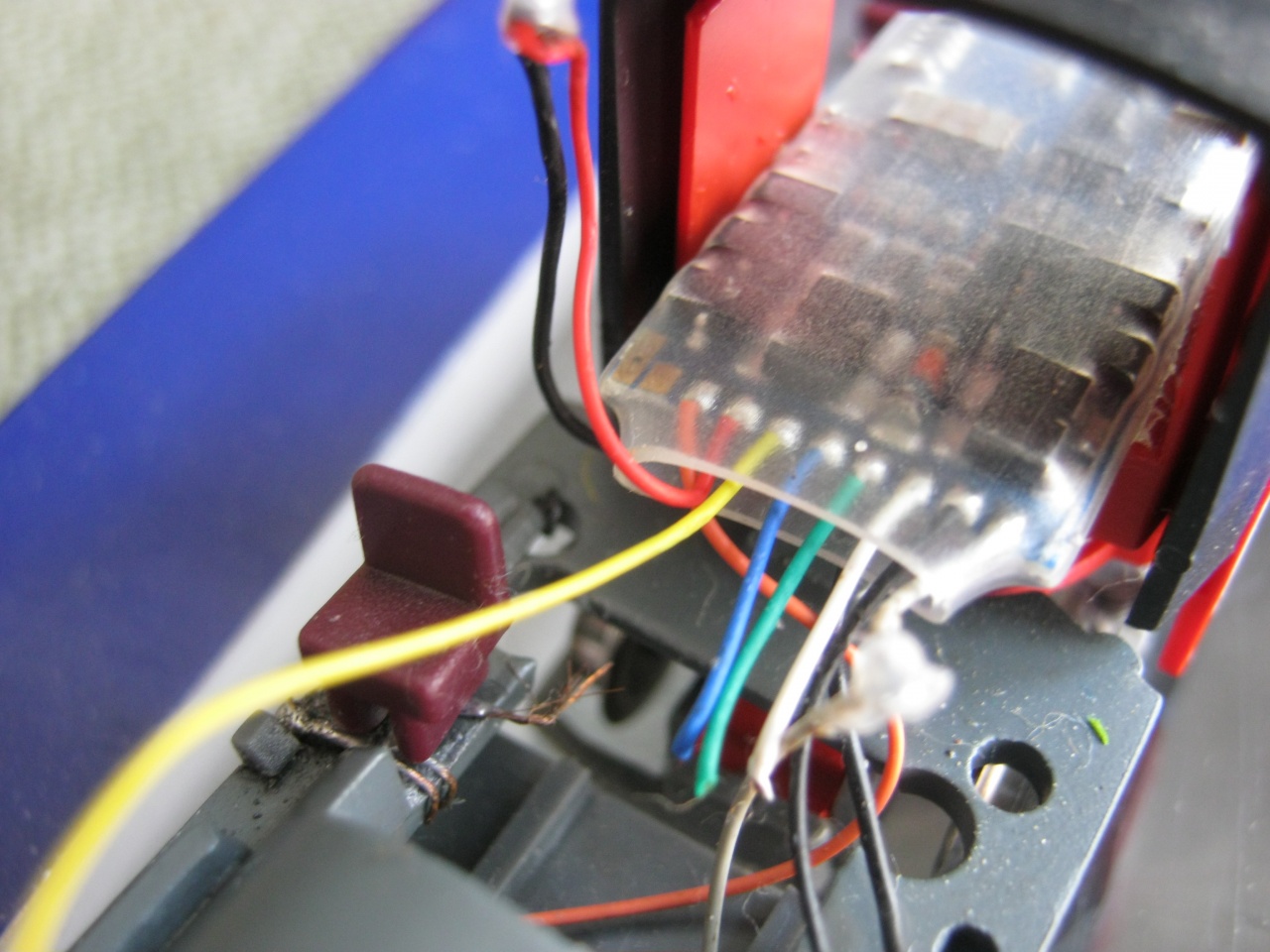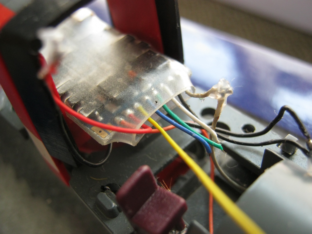 És most jött a fekete leves, mert a javítás miatt leszedtem a modell kaszniját. Erősen vontam fel a szemöldökömet, mert ez a ROCO villamos egy DCC előkészített modell gyárilag, NEM652, vagyis a megszokott 8 lábú dekóder aljzat van benne. Ehhez képest a képeken is látható borzalom fogadott a modell belsejében.