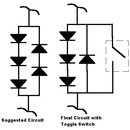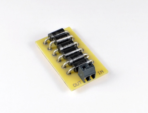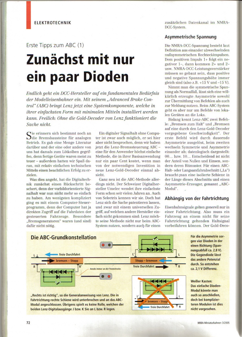 A Lenz ABC az a 4+1 diódás kapcsolás. Vagyis az egyik irányban 4 soros dióda, ezzel párhuzamosan egyetlen, de fordított polaritással. Lényeg, hogy nem lehet Schottky tipus! Hagyományos planár diódákból kell összerakni, pl. 1N4001. Minden más kókányolás, és csak zavart okoz. Egyedül a Tran dekóderelben lehet a diódák által keltett feszültség esés értékéhez állítani a dekóder aszimmetria érzékelését (CV162-ben), a többi ABC-s dekóderben nincs ilyen lehetőség.