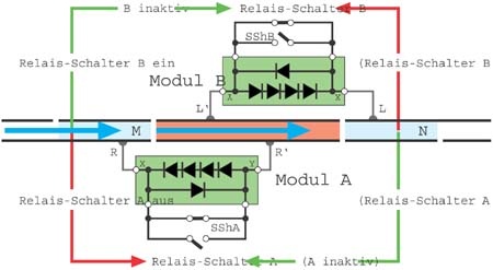 Végül az 1N4007-es verzióból épített 4+1-et választottam. Tegnap este még megterveztem a kiegészítő modult a PACO 4 fényű szemaforhoz, hogy vörös kivételével minden esetben át legyen hidalva a megállító szakasz.