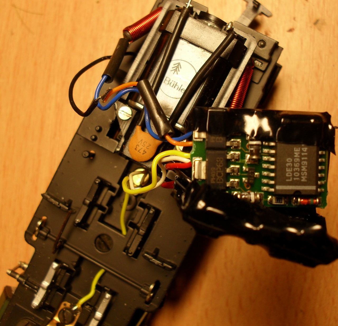 Pl : szürke vezeték nincs rajta, a motorra a kék és a piros van kötve, a kerekekre a narancs és a fekete. A kondi egyik szárát már én nyestem meg, hátha... de nem. |