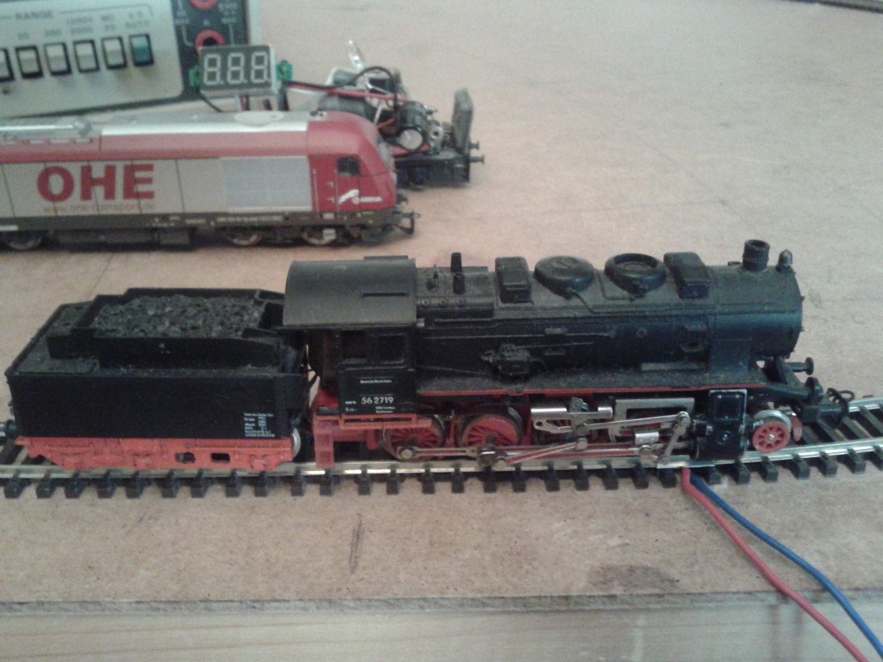 Van vagy 50 éves, de tanítani kéne pár mai konstruktőnek, hogyan kell tisztességes tender gőzöst építeni. Egy ZIMO MX600-at kapott, és nagyon szépen muzsilkál vele. A dekóder motor szabályzását nem kellett programozni, itt a műhelyben a Tran központtal nagyon szépen vitte a dekóder a mozdonyt. Este megjött a visszajelzés is: ROCO MultiMaus, 10764 erősítő, és a nagy 10725-ös trafó, CSM200 stabilizátorral vezérelve is csak a dekóder címét kellett beállítani, meg a gyorsítást/lassítást, végsebességet. |