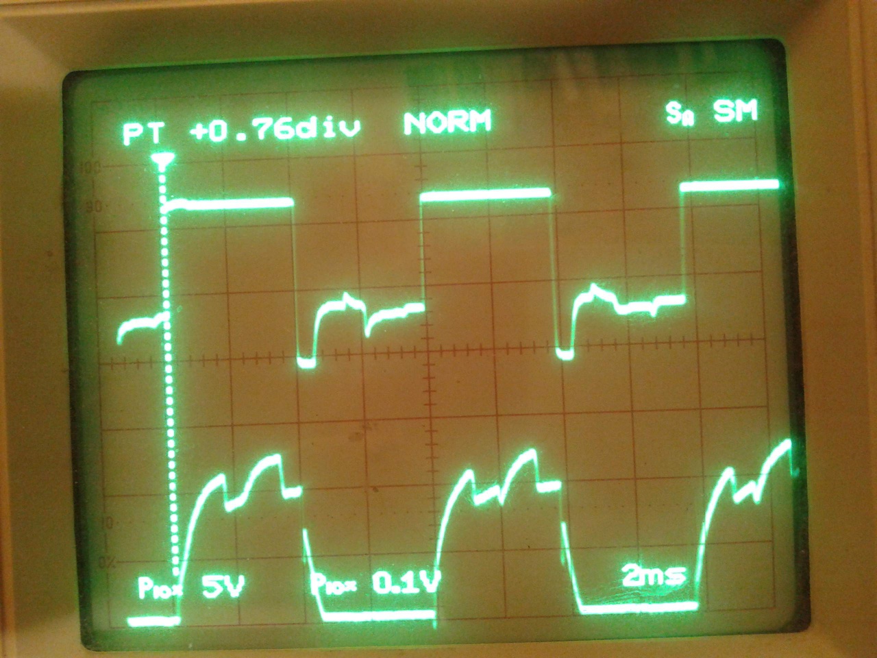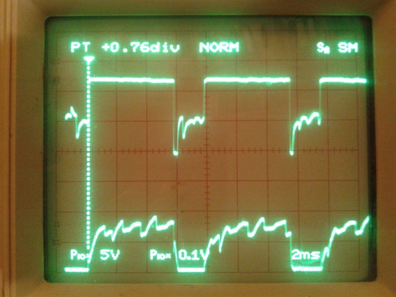 Mivel a Kühn-ben kicsi nyugalmi súrlódás (kicsi a kefenyomás, ill. jó a csapágyazás) 30kHz-es PWM-nél sokkal szebben indul, mint a gőzös, de igazán akkor megy lassan akadozás mentessen, ha 10ms-ként a PWM kb. 30us-os idejét felnyomom 2ms-re. Nyílt hurkú a PWM, mert kis sebességnél kicsi a BEMF, nem sikerült az AD konverter jelét jól használni. Nagy jelet persze könnyű, egy második ADC csatornára leosztott BEMF jellel.