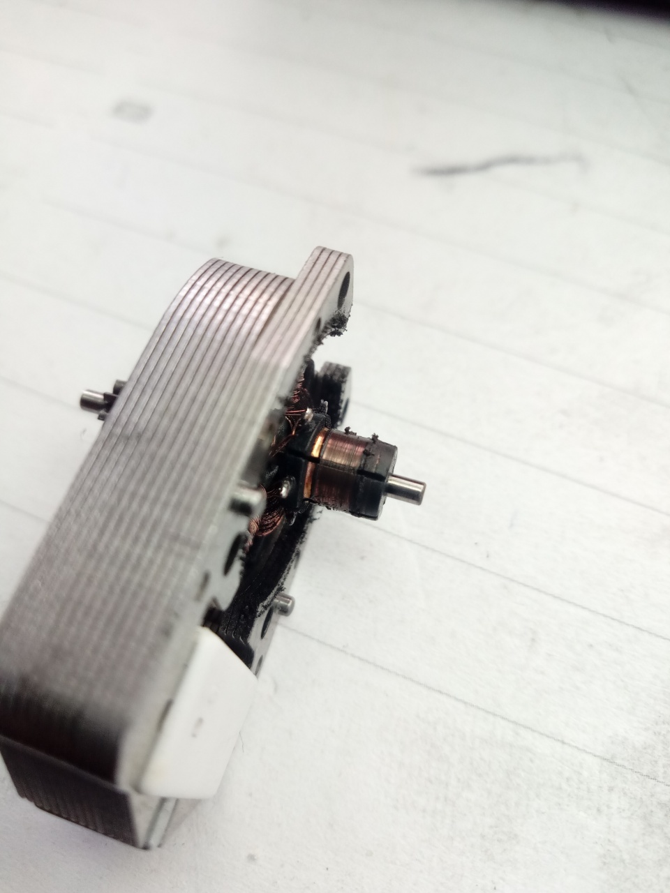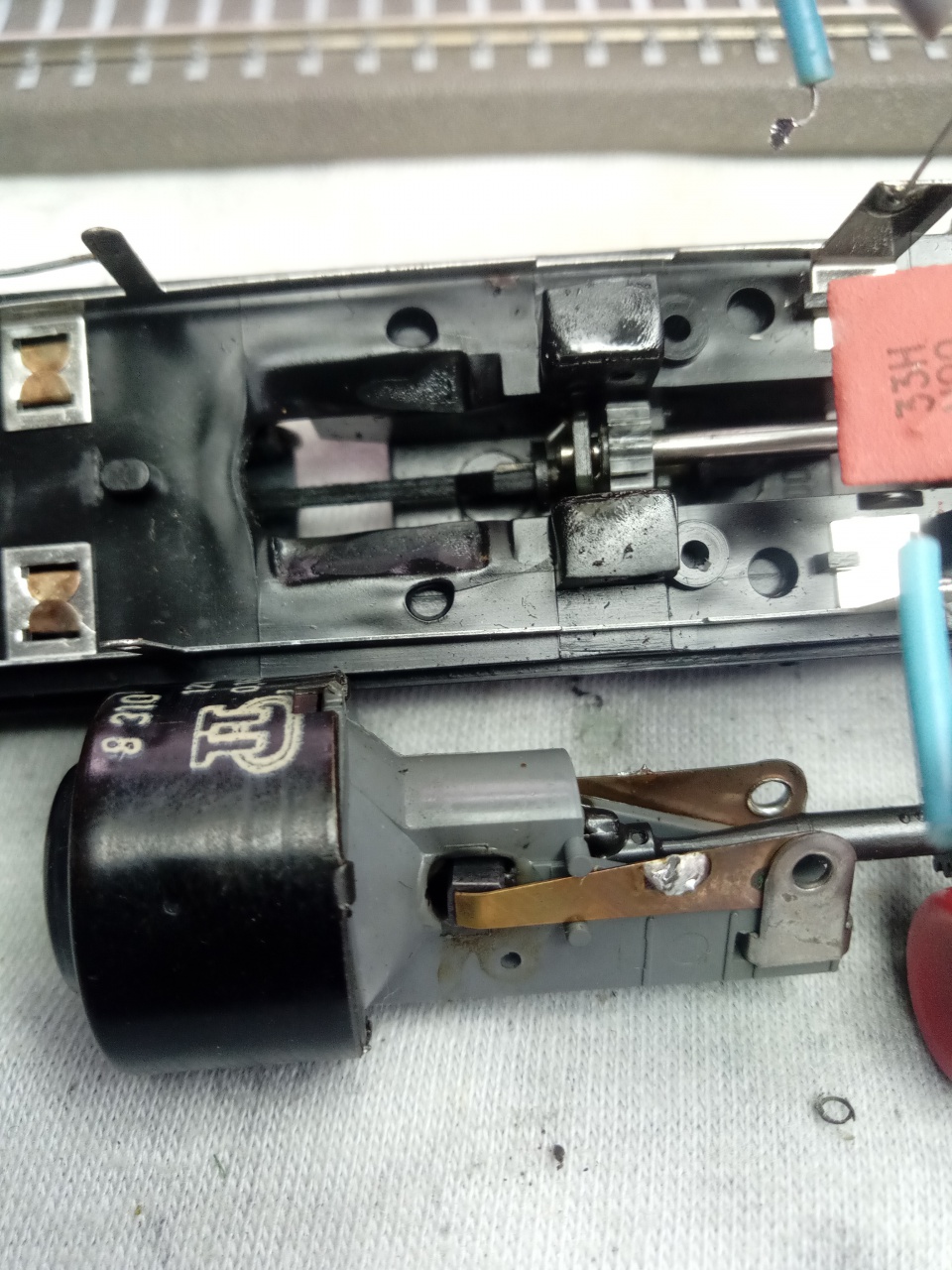 Benyeltek egy legalább 50Euro-s költséget maguknak a dekóder cseréjével, plusz a munkadíjat, a semmiért. Ugyanis a baj a képen látható. Totál zárlatban van a motor összes kommutátor lemeze, mert vastagon eltömte az olajos kefepor. Ez egy nagyfrekvcenciás PWM jelre (ilyen az összes mai dekoder, a DCC is, meg az Märklin is), gyakorlatilag zárlat! Megmértem a motort, mielőtt szétszedtem, sima egyenárammal hajtva majdnem 1A-t vett fel! Ez egy H0 modell, nem kerti vasút. Csak ki kellett volna pucolni Göppingenben a motort...