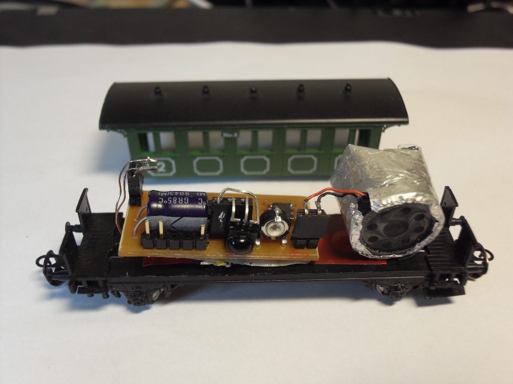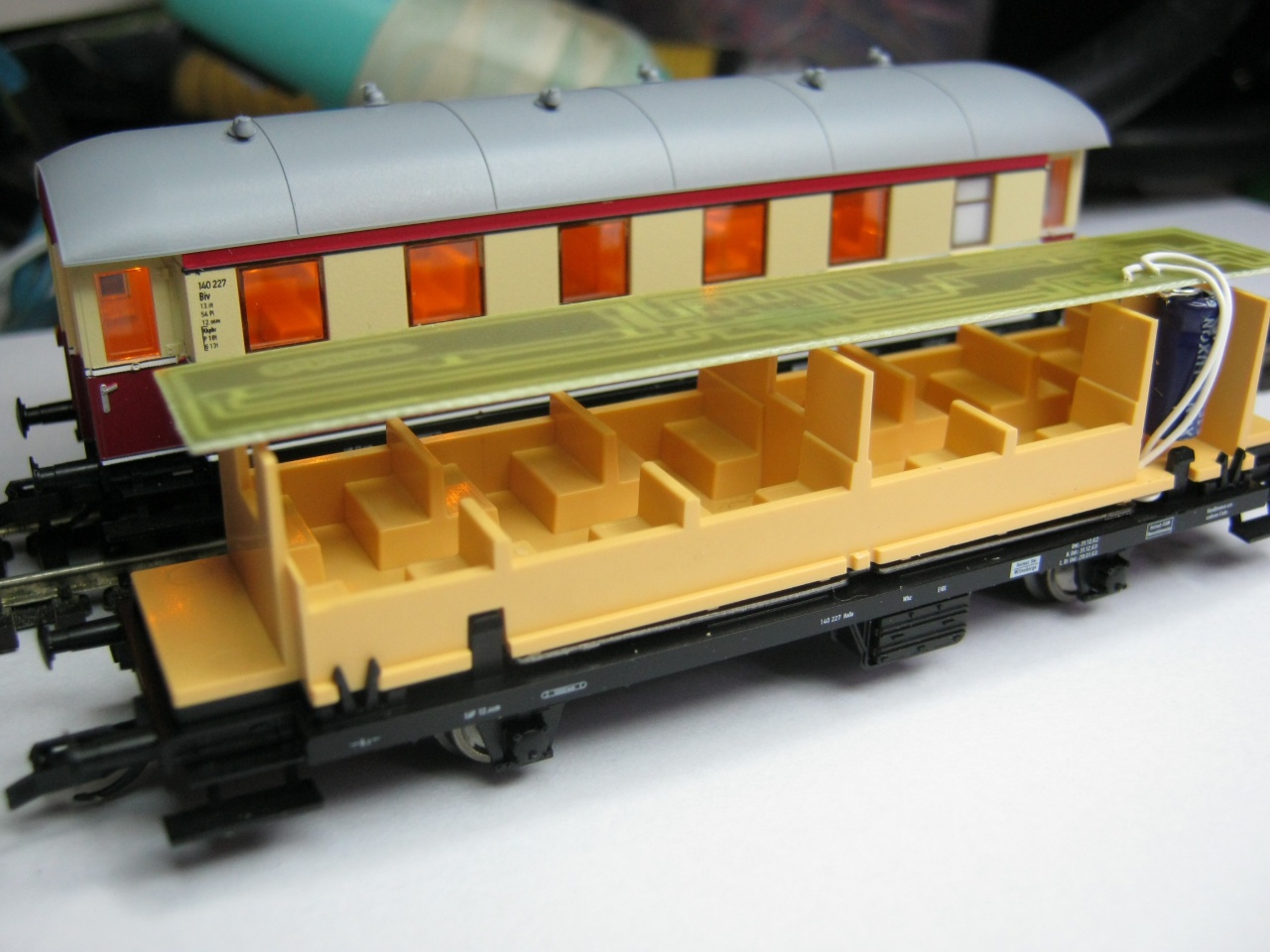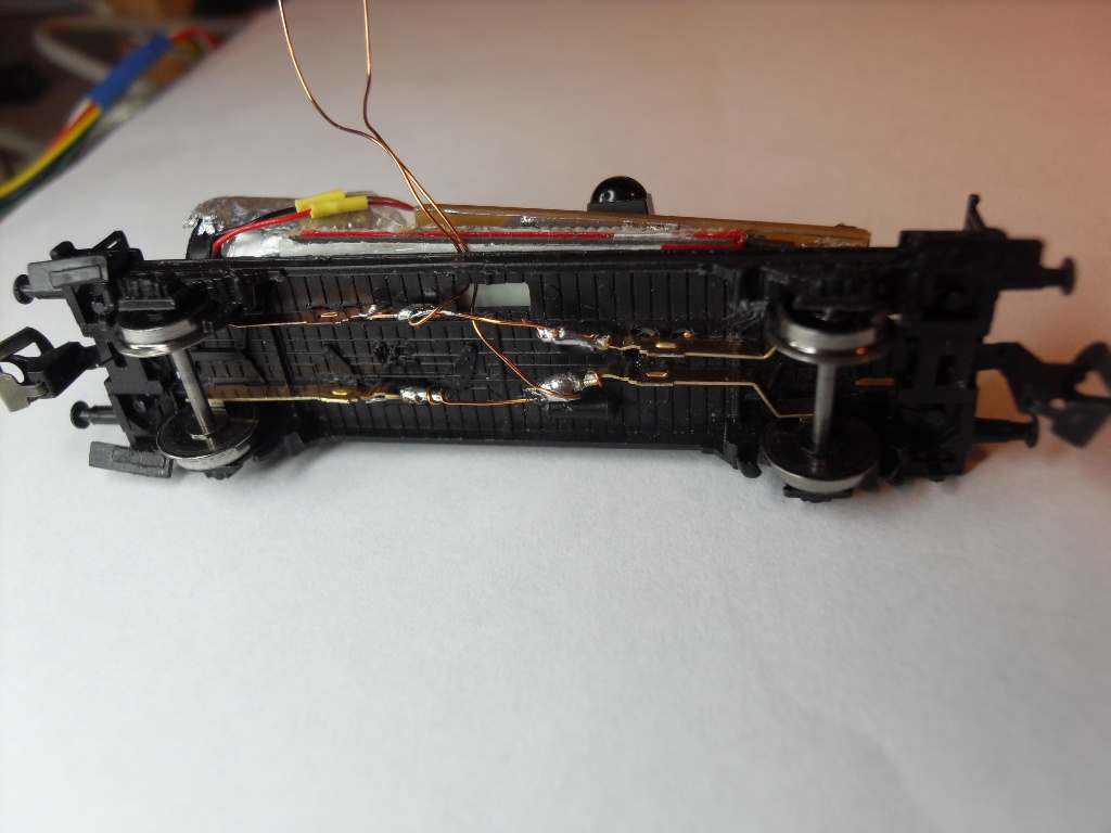 Képen a Schirmer megrendelésére készült belső világítás protopéldánya, egy szál 100mikroFarad a puffer, a kocsi még a műhely koszos sínén is vibrálásmentesen működik.