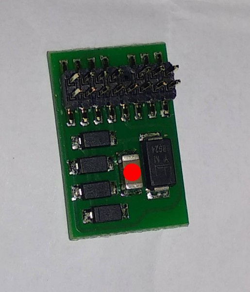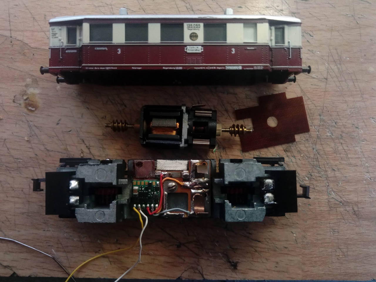 A képen egy ősrégi Minitrix VT135 átépítés közben. A dekóder egy ZIMO MX616. |