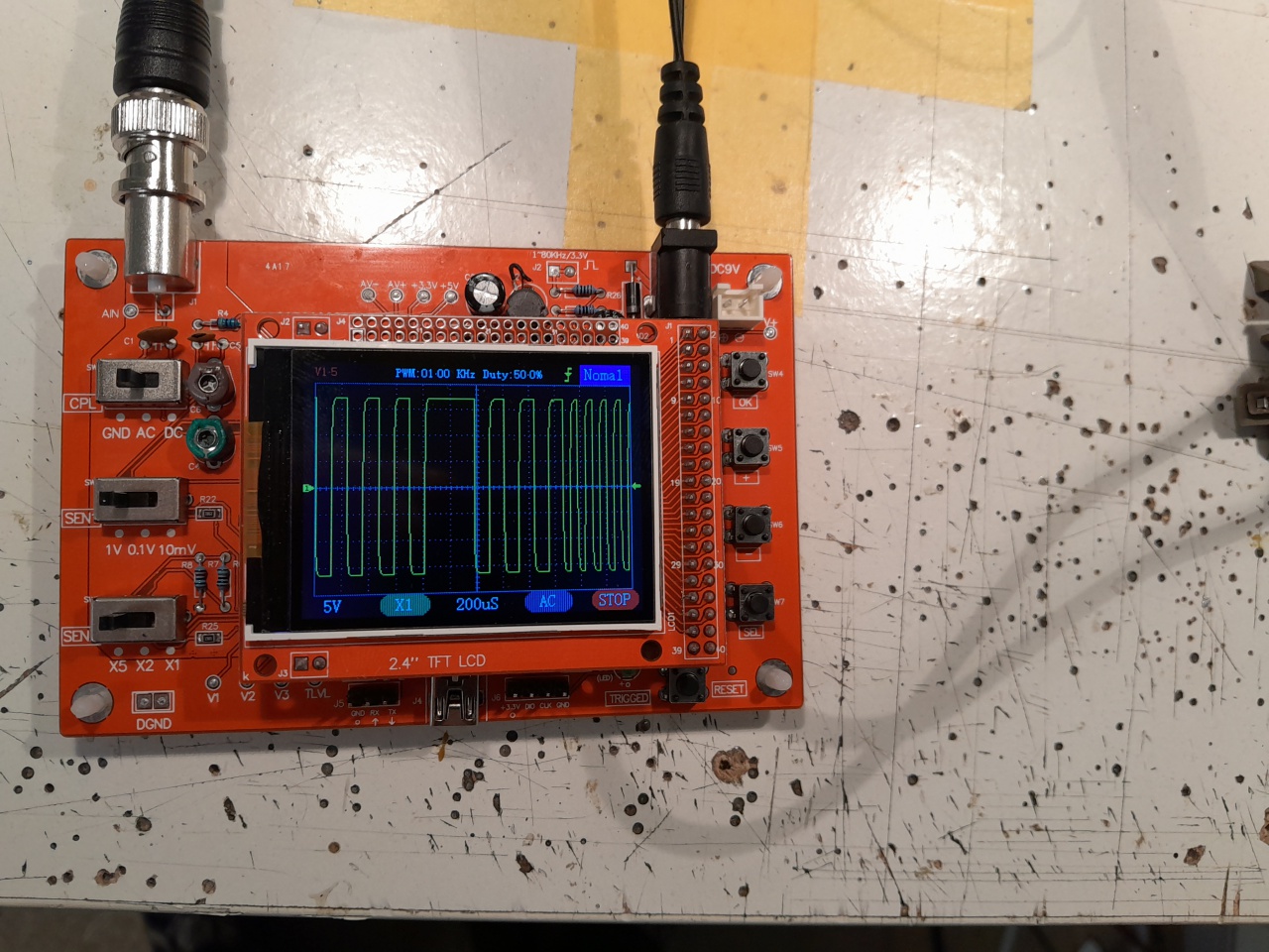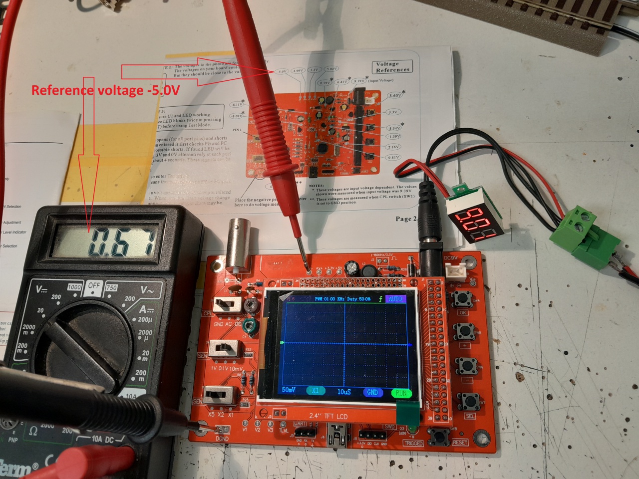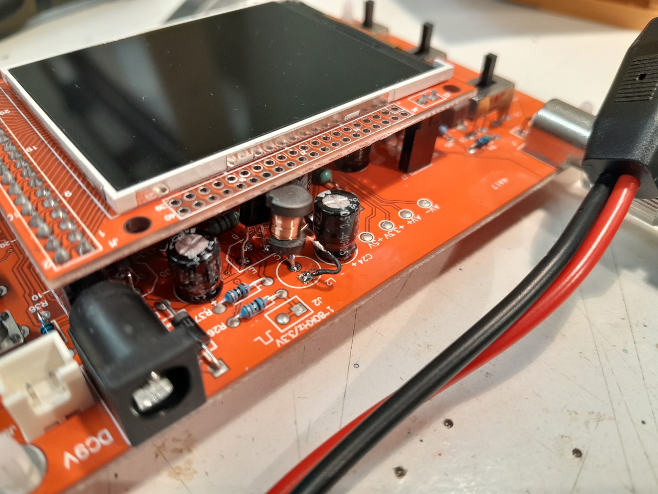Múlt héten megjött a csomag, de KínaiTv szerelőt játszik a szkóp: Tyekép Tyehang. Jobban mondva van kép, csak jel nincs rajta. A kijelző működik, de semmi bemenő jelet nem dolgoz fel, szép sima 0V jel van. A referencia mérőpontoknál az áramkörön akad gond, nyilván ez a baja. Ahol -5V-nak kéne lennie, ott +0,6V van. És még más mérési ponton is gondok vannak a negatív feszültséggel a szkóp áramkörén.