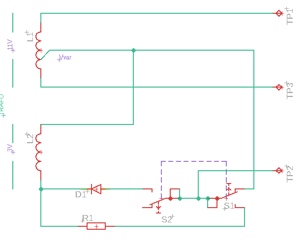 Az L2 a segég kimenet, ami kb 3 V-ot ad az L1-röl levett feszültséghez egyenirányitva és söntölve ha a dupla pillanatkapcsolo S1+S2 a másik állasba van nyomva. Ilyenkor az L1 tekercsröl levett válto feszūltséghez hozzáadnak kb 3 V pulzálo egyenáramot, a másik félhullámot a sönt viszi ki.