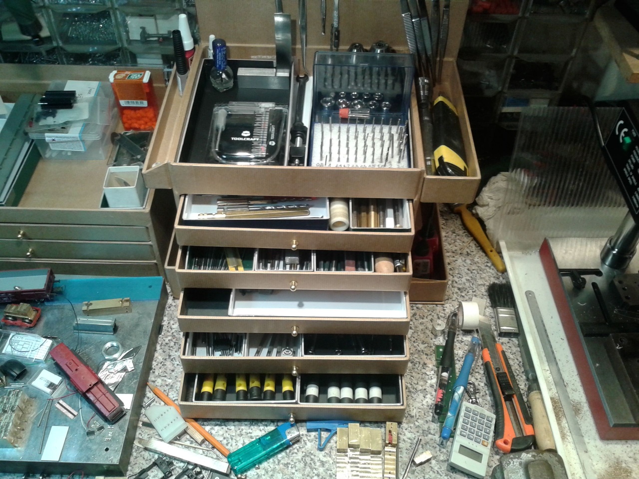 Netes rendelésemet az áruház vissza is igazolta. Majd telefonon hívtak, hogy sajnos csak szeptemberben tudják majd szállítani. Ez még belefért, és ma meg is érkezett a fúrógép szett. Munkába is állt, egyelőre tetszik. Hobbi célokra szerintem tökéletes, meglátjuk, hogy a műhelyben mennyire bírja a starpát. Egy biztos, nyomtatott áramkorbe 0,6mm-es lyukat fúrni hajszálpontosan, nos, erre alkalmas.  |