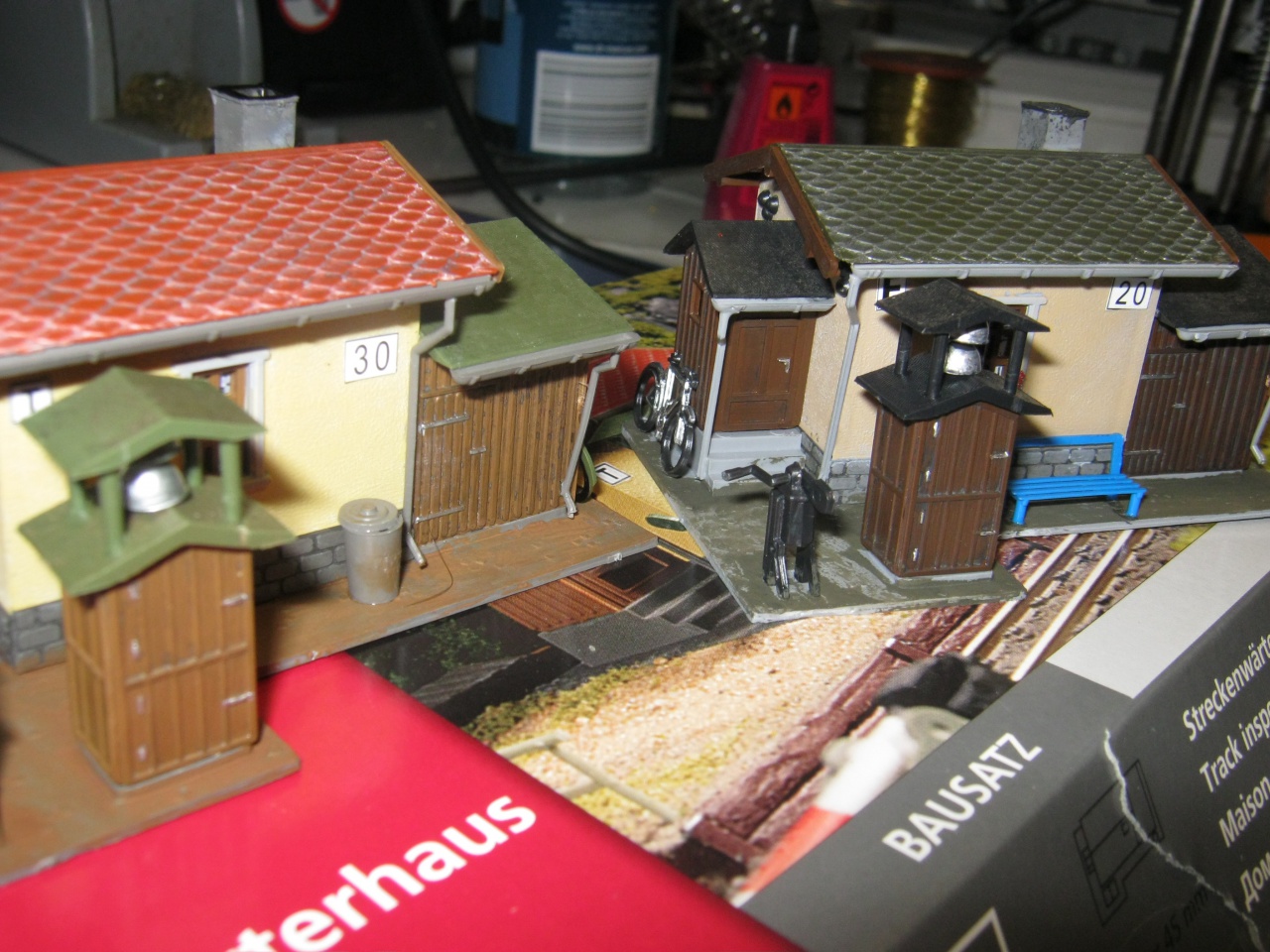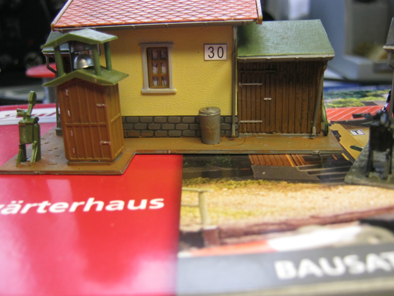 Két Auhagen őrház. Az lesz a feladatuk, hogy egy-egy helyen elrejtsék azt a kapcsolót, ami a Tillig H0 Elite H0-H0e keresztezés polarizációját elvégzi. |