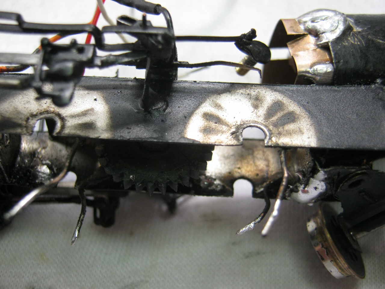 Közben az ember azért nézelődik a modell bontása során. " Na ezt is alaposan elkoszolták a használat alatt!"- gondoltam. De neeem, áááá... Miért is volt bizonytalan az áramszedése, és ettől is ment nagyon rosszul? Lásd a képet! Ugyanis a modellt teljesen készre összerakták, és utána fújták telibe, sima matt fekete festék spray-vel...