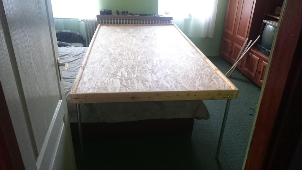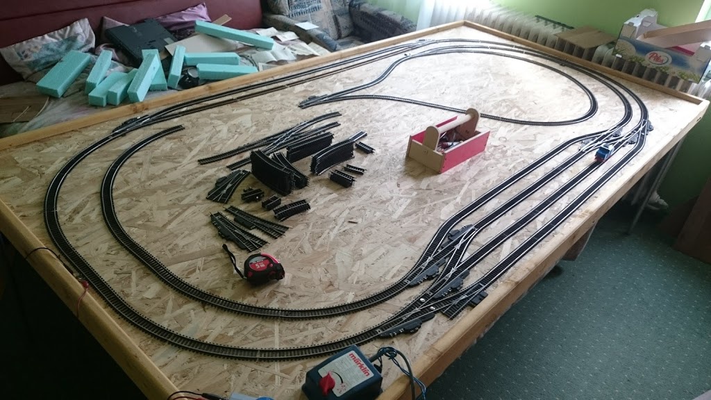 A jelenlegi próbapályám 150*250. Alapja egy 150*250 1cm-es polikarbonát lemez, és hozzá habbal ragasztott 6cm vastag eps 100-as lemezek.... aha  Meglepően könnyű, így egy ember is tudja hordani, vinni. Egy kicsit nyeklik/nyaklik, de amire létrehoztam tökéletes. Lehet rajta próbázni, és emelkedőket tesztelni, hurokmodullal játszani. Ha ráeresztem a PC-s vezérlést, akkor meg jön-megy rajta 4-5 szerelvény is