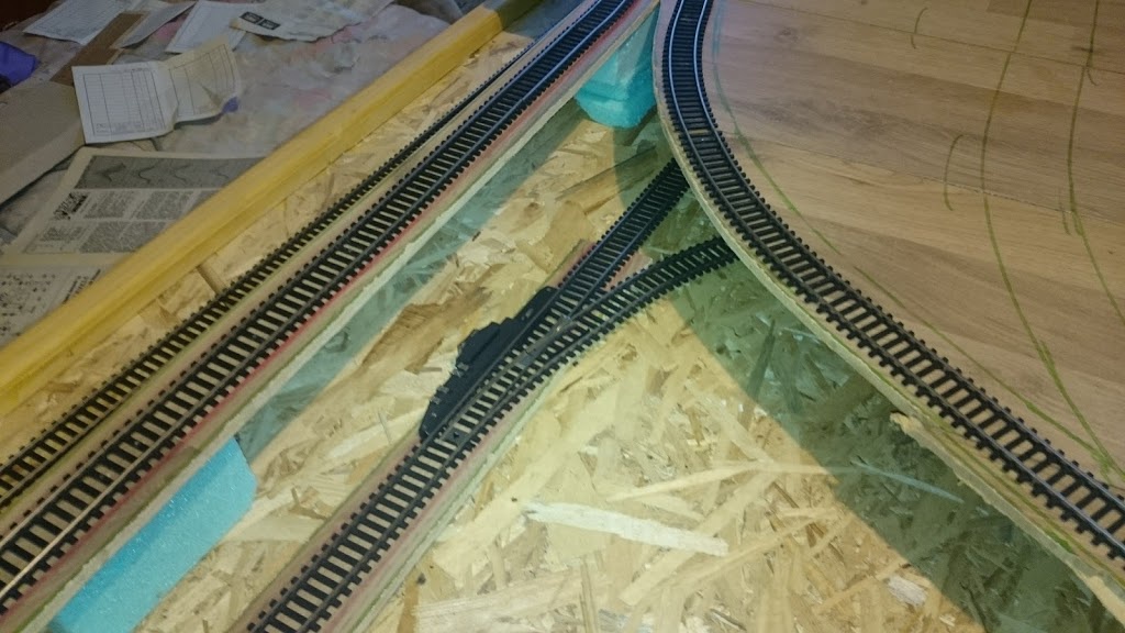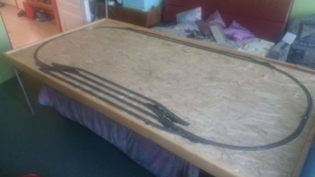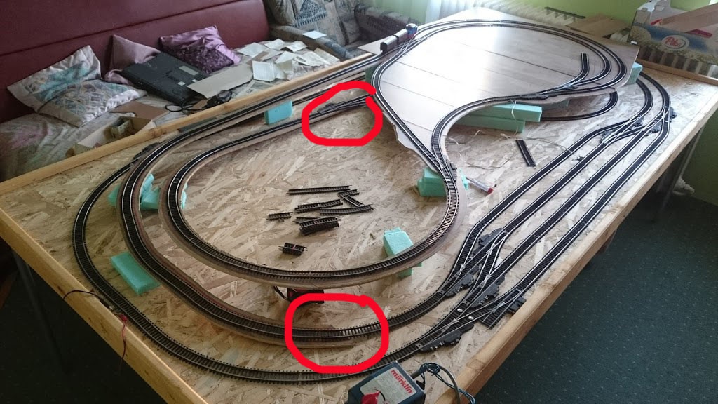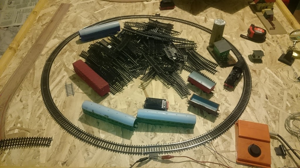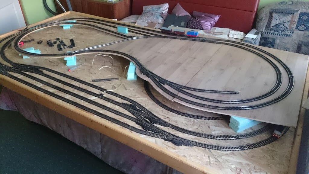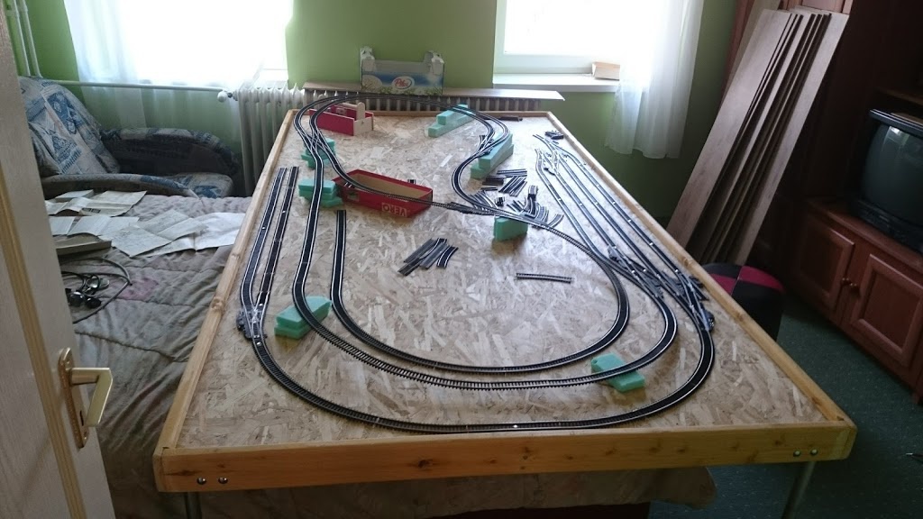 Egy nyers összeállítás így már jobban átérzem. Belekerült a rejtett hurok is alul. Egy iparvágány felül még lesz a deltából de nincs több váltóm..A gyereknek felraktam pár kocsit meg a motorvonatot.. a hurkok természetesen nem mennek csak ha átlököm a váltón a mozdonyt.. |