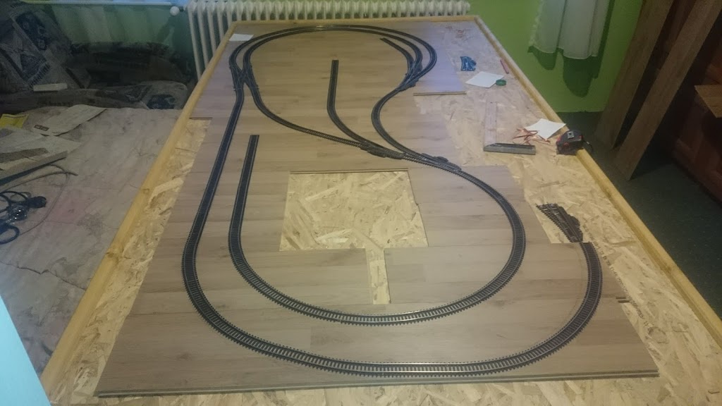 Haladok..Már összeragasztottam a laminált parkettát és a héten kimarom a felső szintet.. Nagyon erősnek és jól hajlíthatónak bizonyult a teszteken ezért ezzel próbálkozom először.. Kiadta magát minden nem kell sín sem váltó pont elég  |