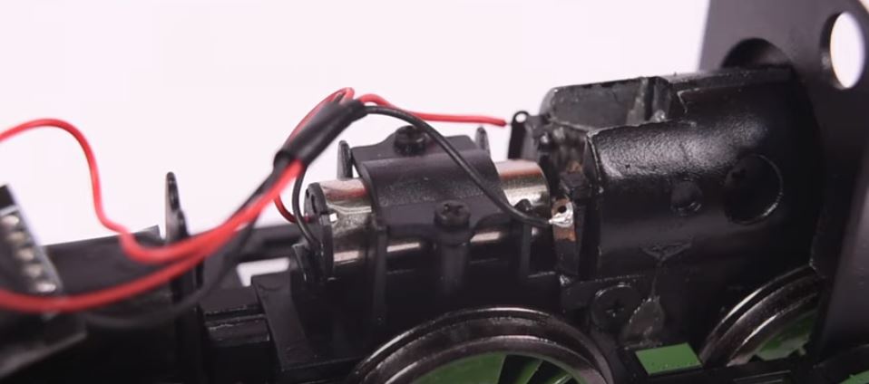 A mozdonyt a filléres játékdronokbol, helikopterekböl jol ismert kb 20x12mm-s vasmag nélküli motor hajtja. ( na jo tehettek volna telefonba valo vibrátor motort is az még kisebb egy ekkora mozdonyba....  ). A baj csupán az, hogy ezek a motorok általában 5-8V-ra vannak méretezve és forgás közben a dronban a hütés is meg van oldva. Nem ugy a mozdonykában. Egy müanyag kb 1,5 mm vastag lappal és két csavarratl rögzitik a motort a könnyüfémböl öntött fogaskerekes hajtomomühöz. Alig 20 perc 6 V-s bejáratás után a motor már 50-60 C fokos!
