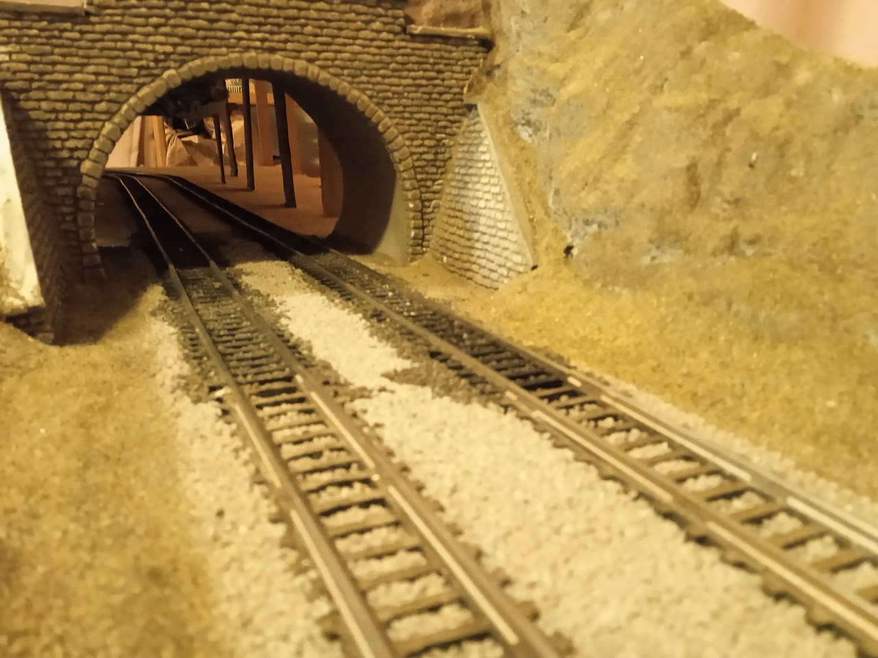 Egy esti kép, egy nagyjából kész, de még cizzellálásra szoruló alagút bejáratról. Régi sínek, régi váltók, PIKO Blocksignal-ok (ezt az utóbbit nagyon utálom szegényt!). Az alagút kapu az Paksinuti barátomtól származik. |