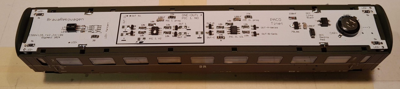 A DR 4t REKO kocsikban ugyanaz az áramfelvezetési megoldás van, mint a halberstadti kocsikban. Most ugye a BRAWA H0-s modellekről beszélünk, csak a többiek kedvéért. Ahhoz, meg ehhez a REKO-hoz is van megfelelő világítás panel, ami eleve úgy van gyártva, hogy a a négy - oldalanként 2-2 - felevezető réz kis fülre csak rá kell ölteteni a panelt, hogy a furatokba ezek a kis réz "pöckök" bebújjanak, és gyakorlatilag forrasztani sem kell. Sőt! Nem is ajánlott!