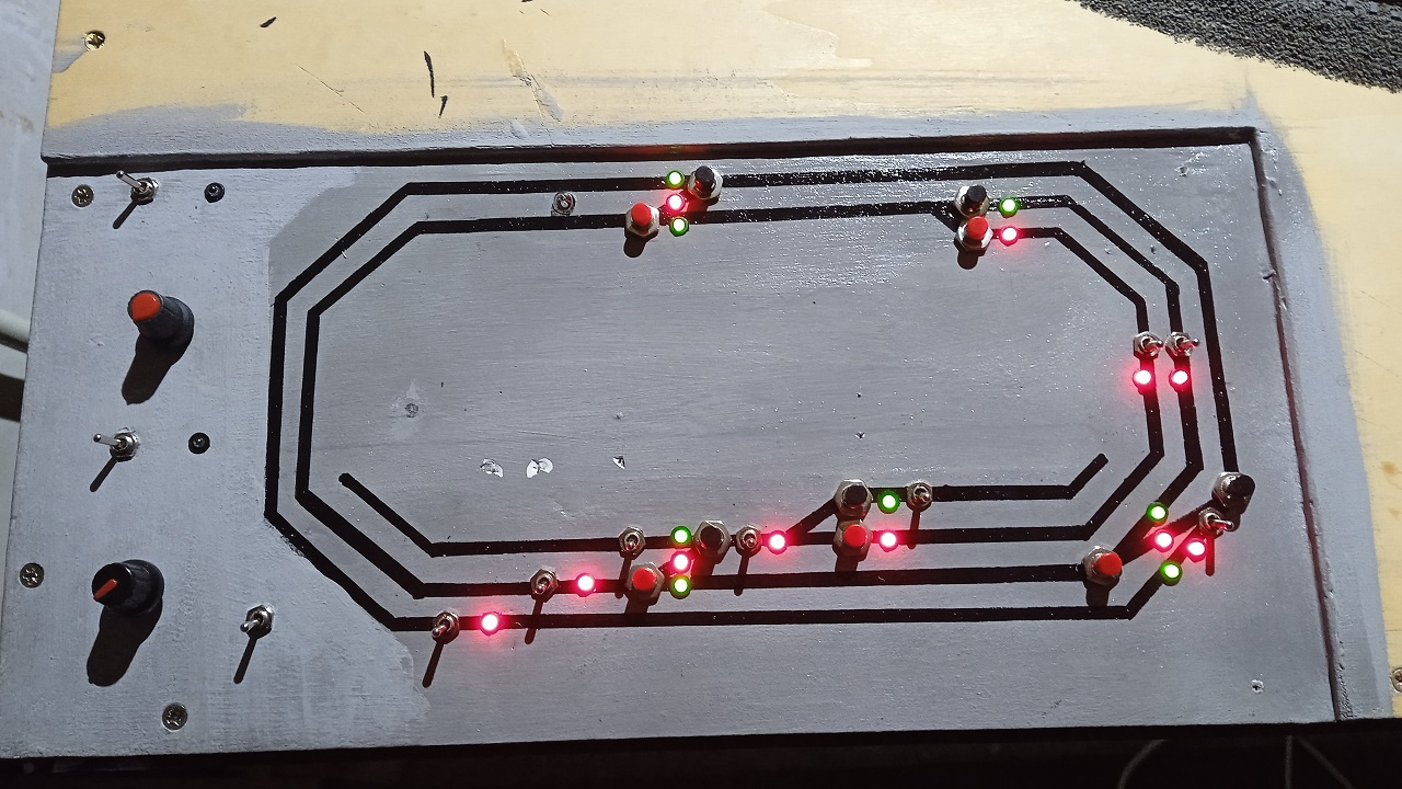 A vágányábrán a kapcsolók a jelzőket, és a hozzáluk tartozó szakaszokat működtetik, ha szabadra állítjuk, akkor a LED fénye is zöldre vált.