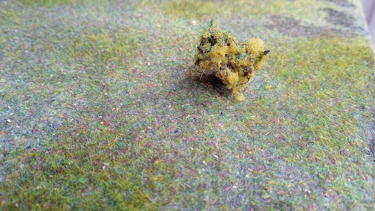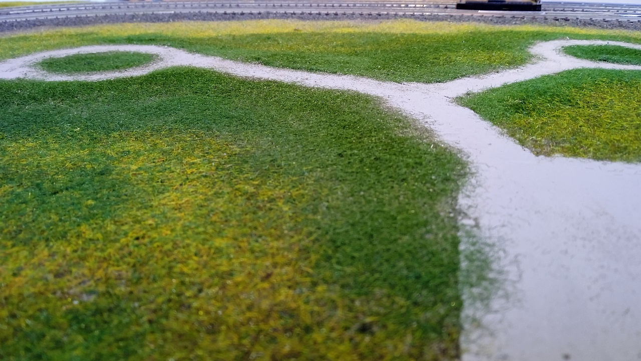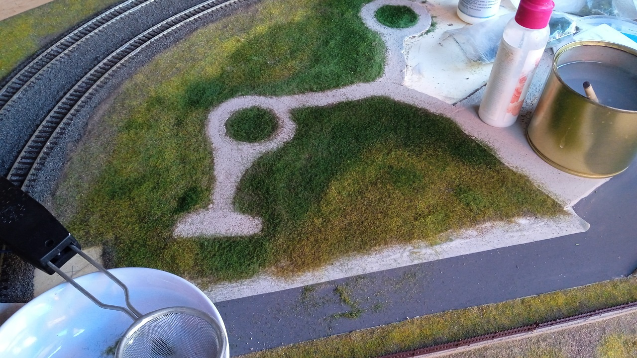 Vékonyan faragasztóval lekenve az alaplemez, rá szitált homok, majd vizzel finoman átnedvesíteni, ahogy a vágányzat kavicságyazatát, higított faragasztóval becsepegtetni, és jöhet is a sztatikus fűszórás. Érdemes több színből, különböző keverékeket készíteni, és egymás utánfelvinni erre még nedves, ragasztós, homok rétegre. Rmélemlátszanak aképeken a munkafázisok eredményei. A sztatikus fűvet én a VMC-ből szereztem be, a saját márkás termékeik nagyon szép színekben kaphatók, ráadásul többféle szálhosszúságban is! Érdems kísérletezni, és a saját elképzeléseinknek megfelelően keverni a színeket. Amitén most mutatok a képeken, az a gondozatlan természet lesz, nem baj, ha foltos, itt-ott kiszáradt a fű/gyom! Ahol nagyon ritkára sikerült, odakésőbb mehet majd egy bokor, cserje, vagy fa. A nagyon egyszínű, kissé műanyag hatású, harsányan zöld fű, az a rendzeresen nyírt, gondozott gyep egy családi ház udvarán. Ha lesz majd ilyen, akkor azt is mutauom majd, de ott még nem tartunk. |