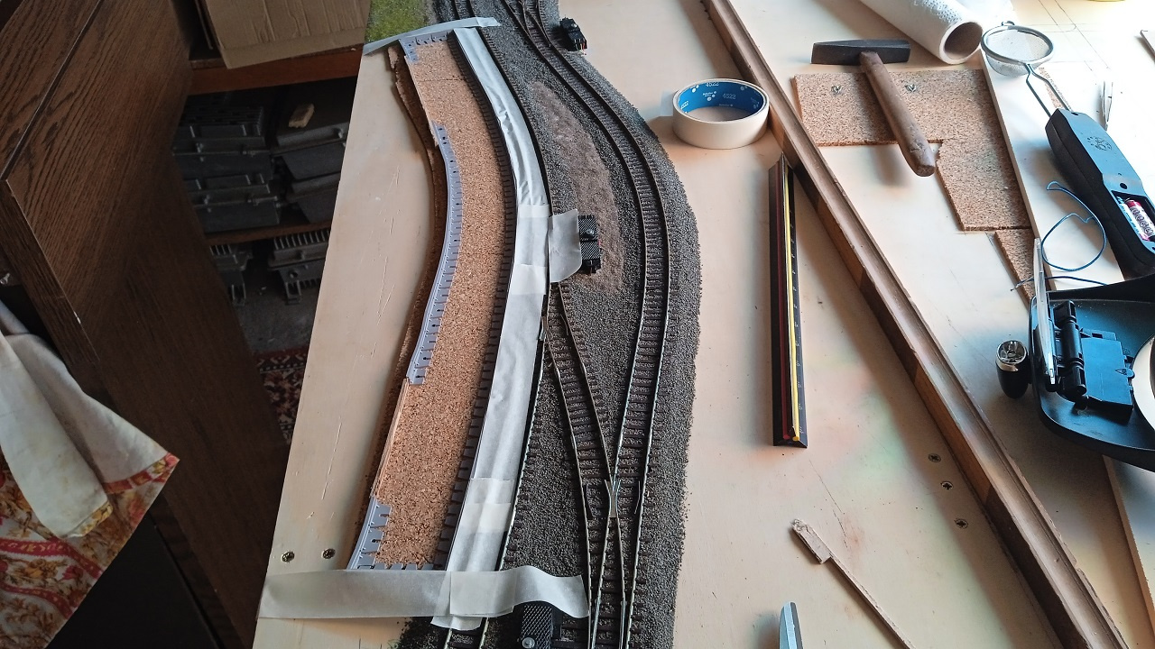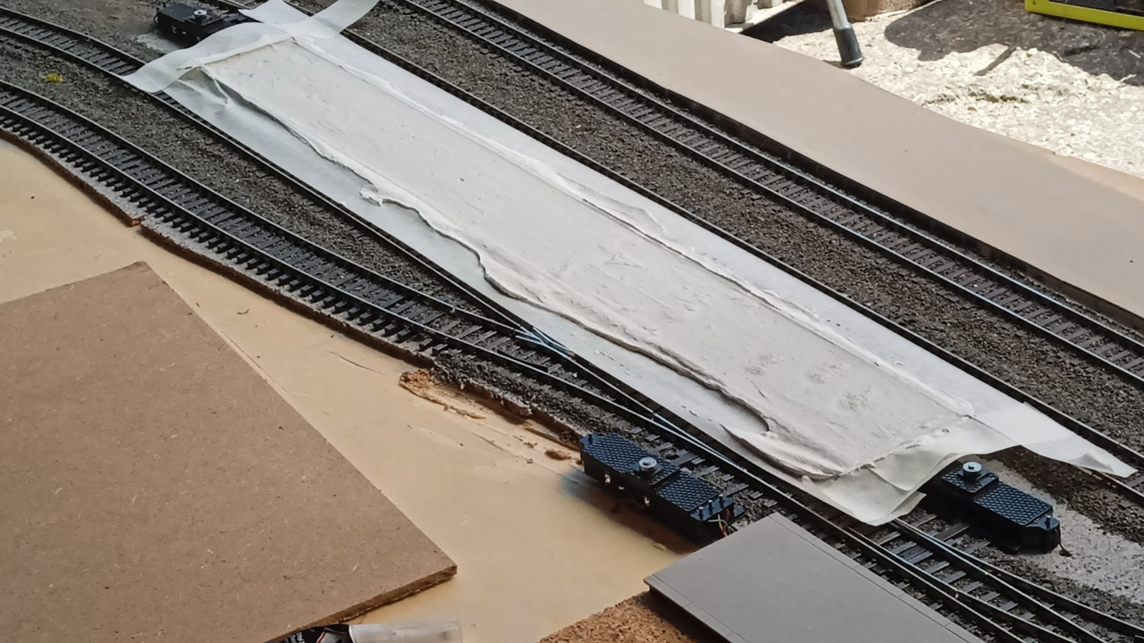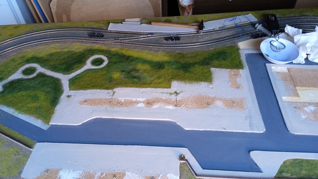 Az elkészítrése a szokásos, 4mm vastag parafa van a vágányok alatt, erre a szokásosmódon van kiszúrva az ágyazatkő. Nem használunk erre eszközt, ecsetekkel van elrendezve szárazon a Paksinuti által készített anyag. Utána nedvesítjük be, és csöpögtetjük be a higított faragasztóval.