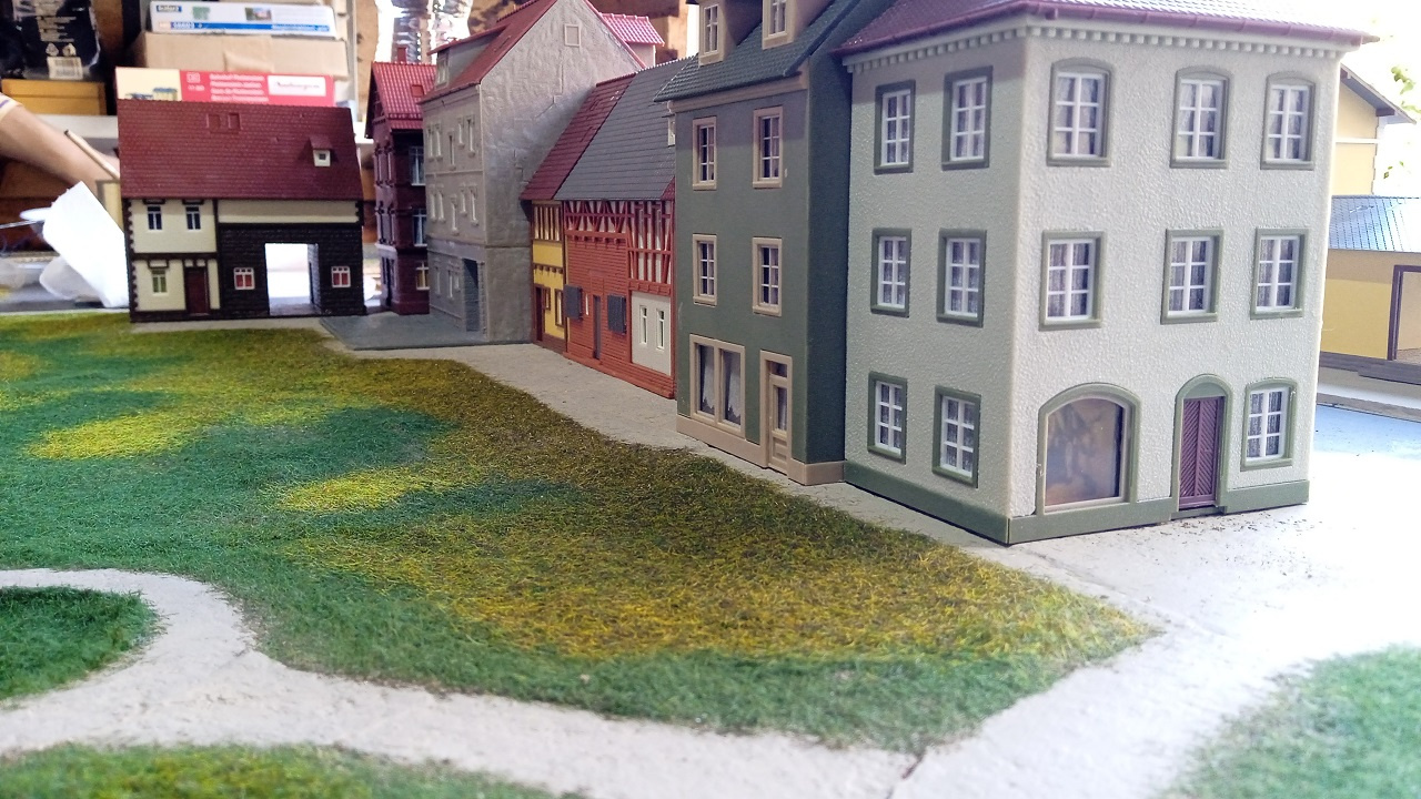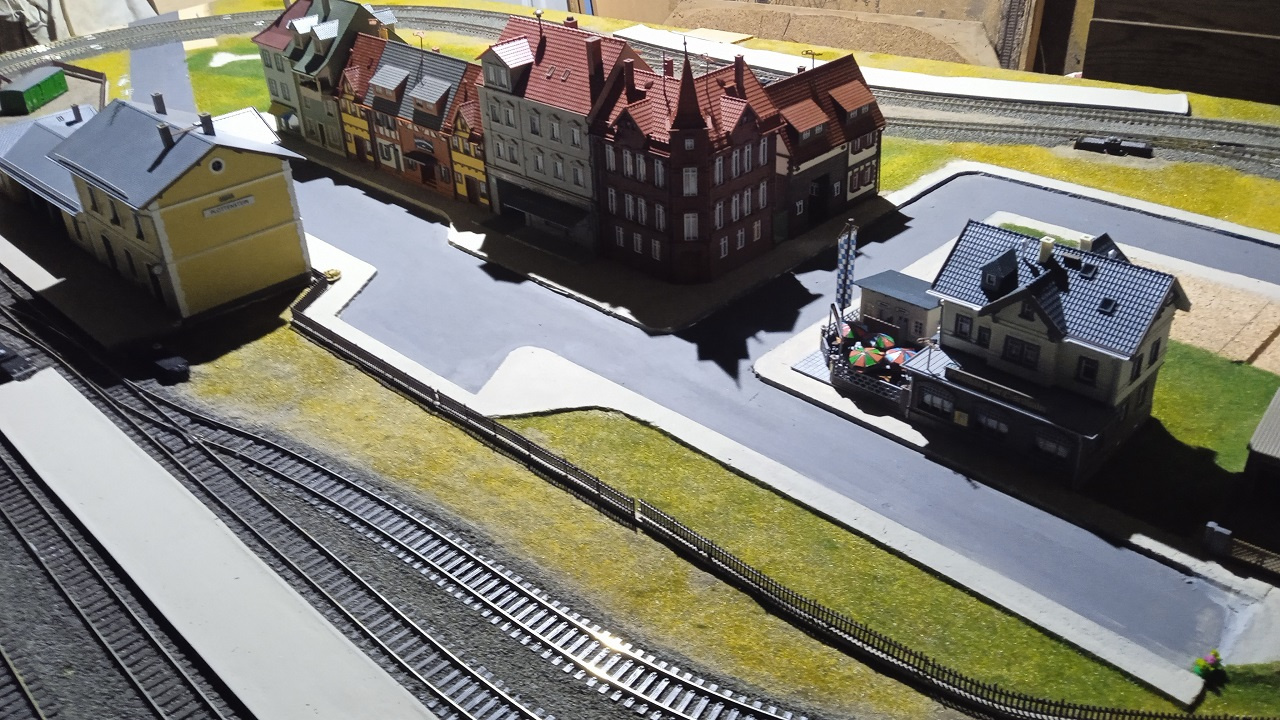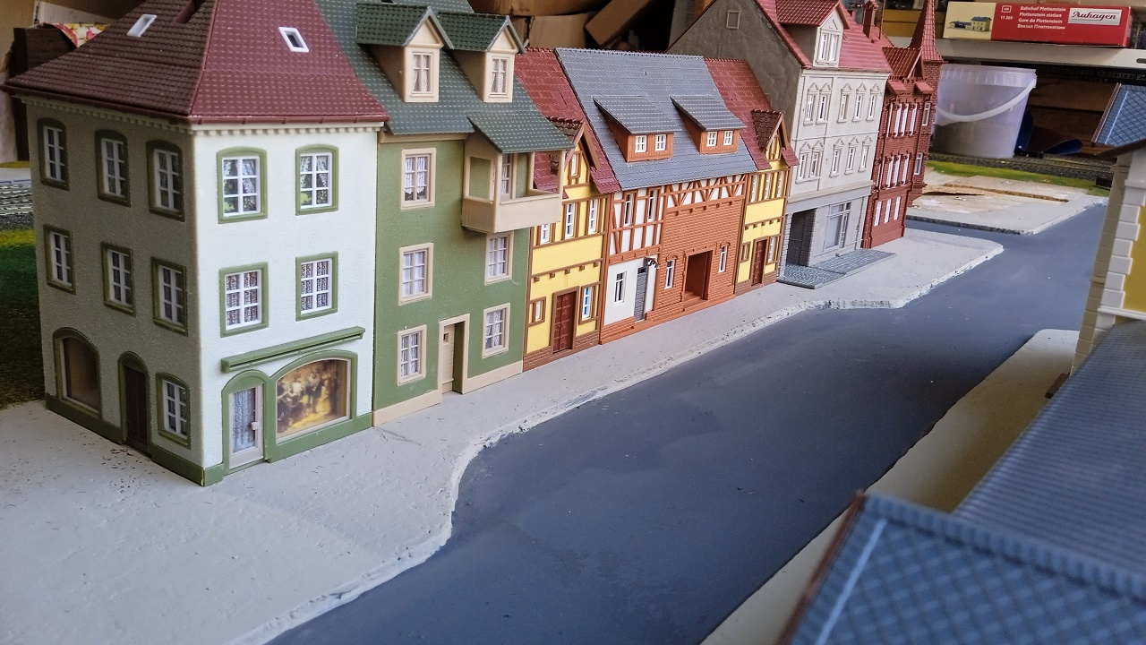 Az Eisenbahn Straße főbb épületei a végleges helyükön. Még hiányoznak az utcabútorok, a buszmegálló kellékei, a jelzőtáblák, és persze a fák. |