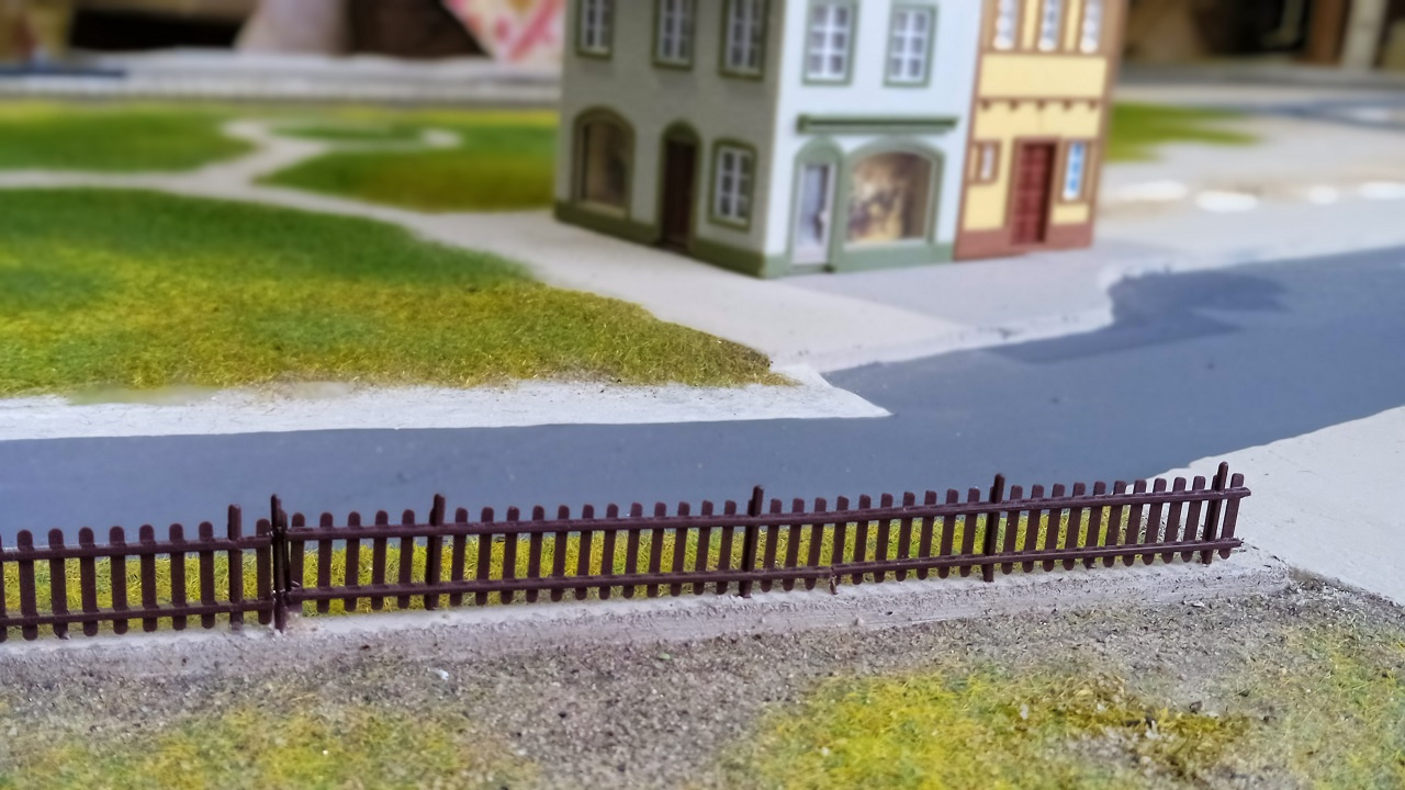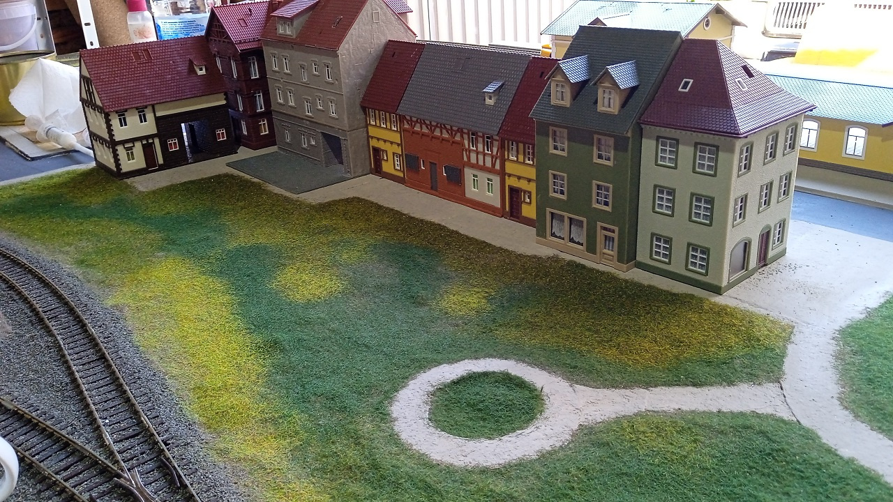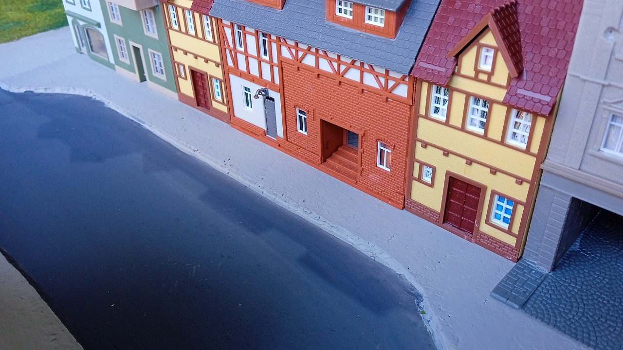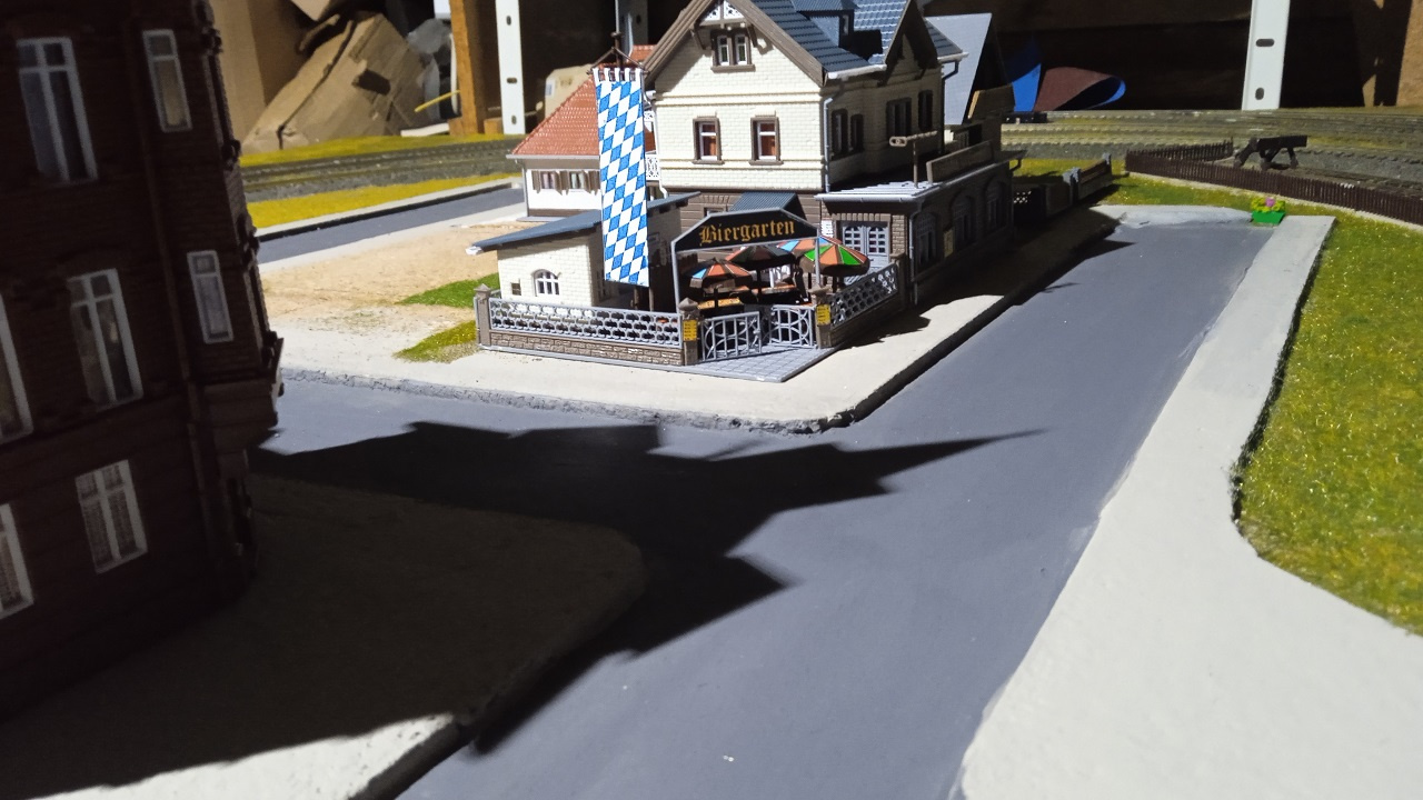 Az Eisenbahn Straße főbb épületei a végleges helyükön. Még hiányoznak az utcabútorok, a buszmegálló kellékei, a jelzőtáblák, és persze a fák. |