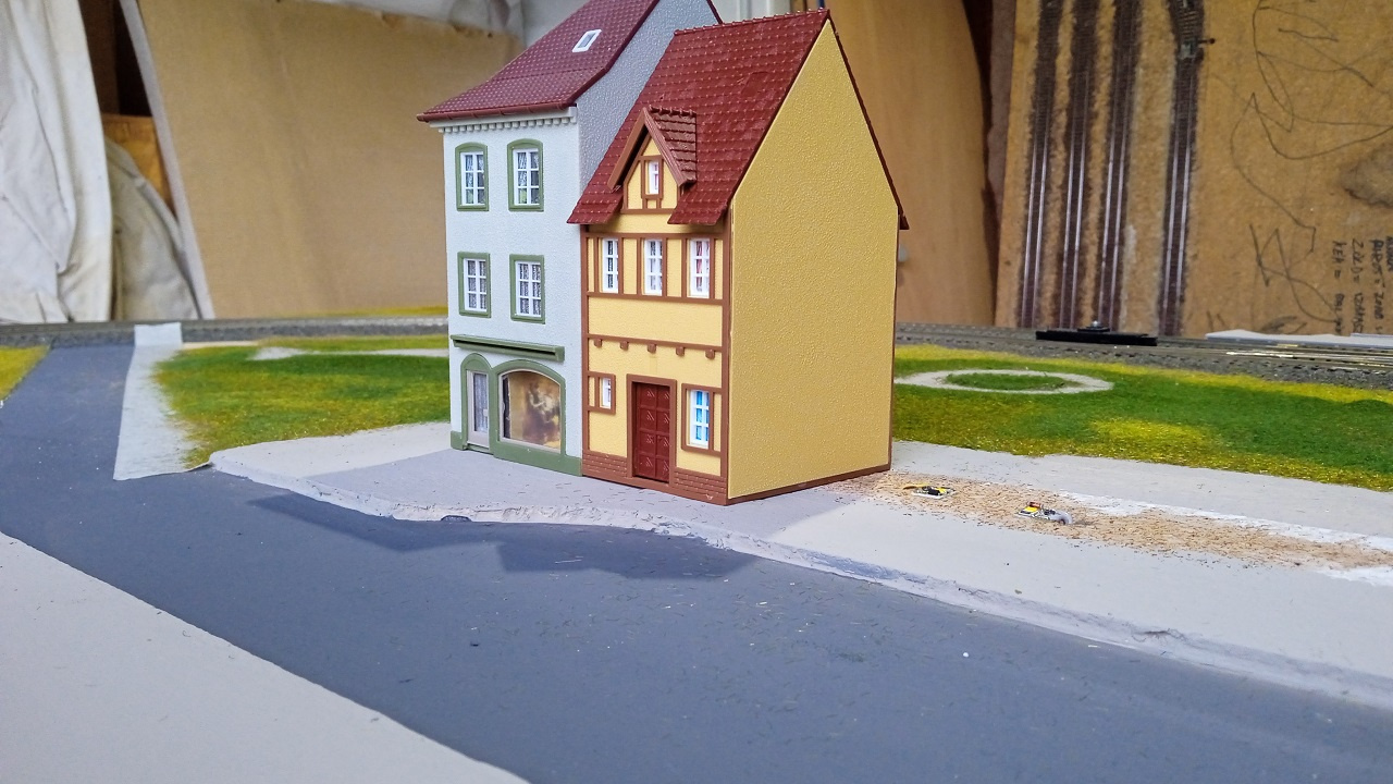 Minden - jelen állapotban lehetséges - vezeték, és elektronika a helyén, noch da zu működik is minden. Az épületek világítása is lassan helyére kerül, de előtte azért a házakat szintbe is kell hozni! Nem csak úgy letesszük őket az alaplemezre! Járda, hogy csak egy dolgot említsek...