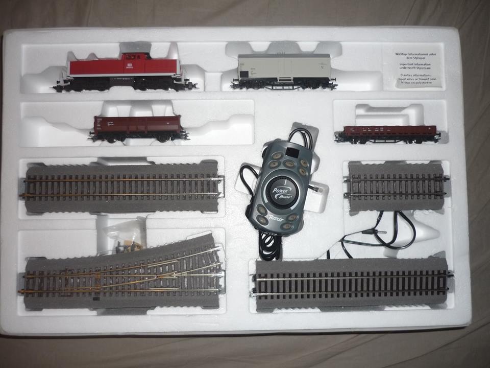Ez egy régebbi ROCO kezdőkészlet, még a szürke színű LokMaus2 vezérlővel, egy DB AG tehervonattal, és a RocoLine gumiágyazatos sínkészlettel.
