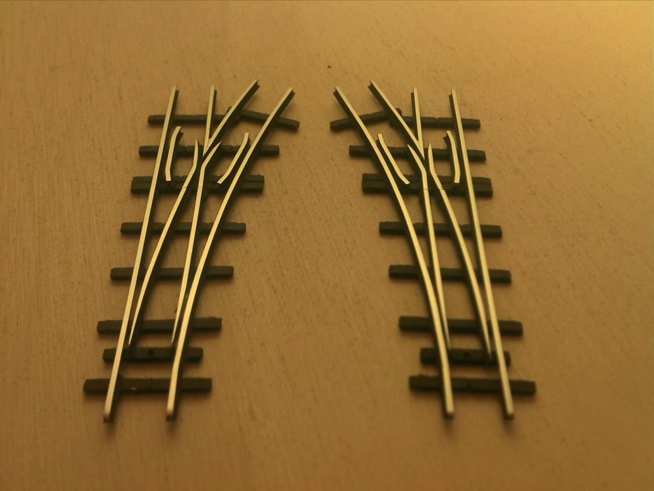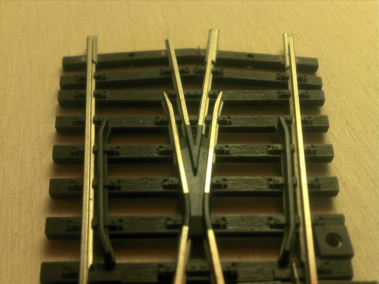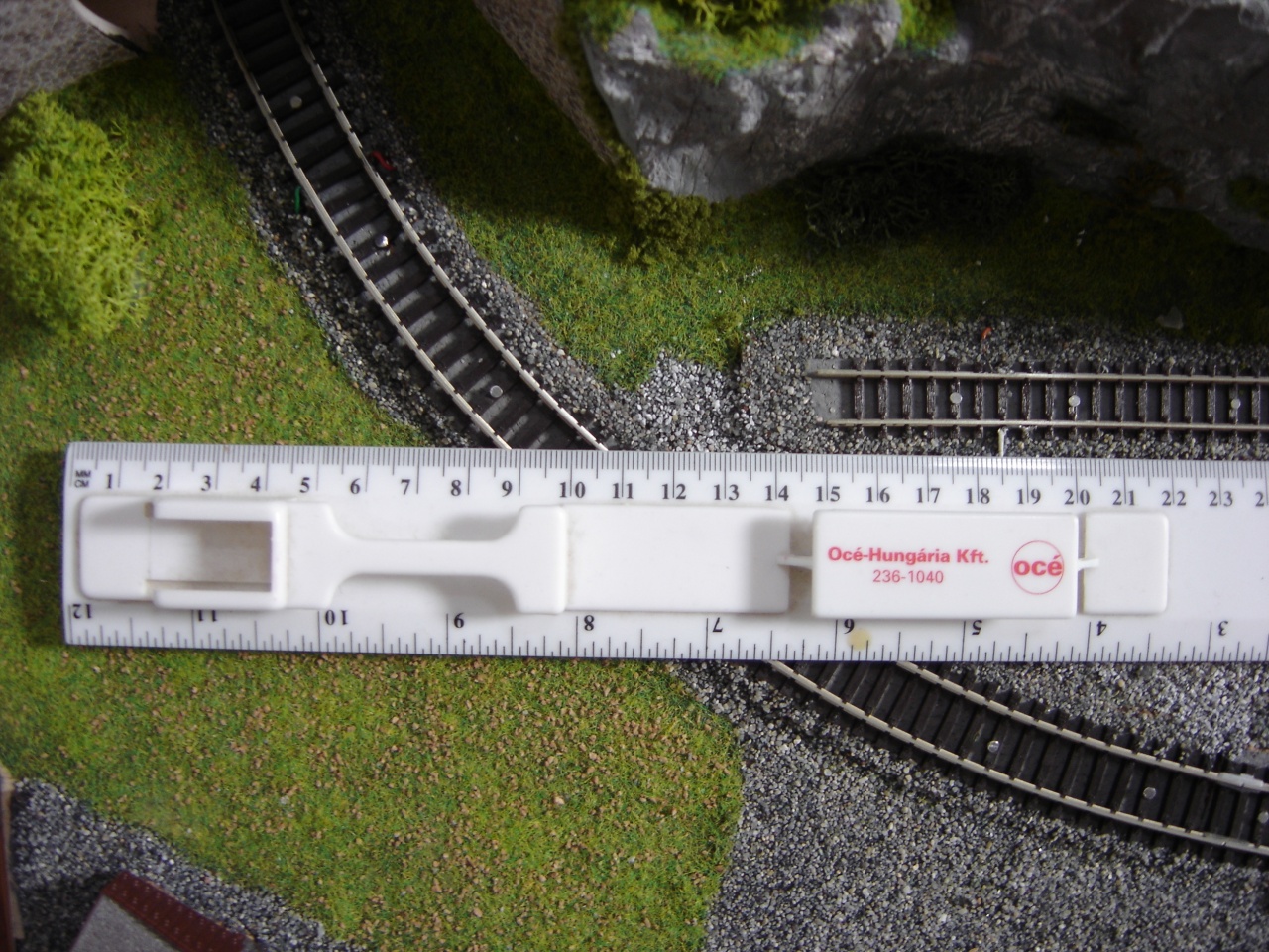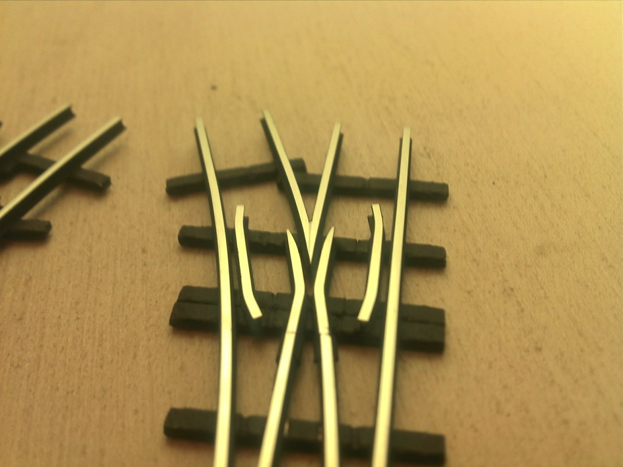 A Busch koppintásnál vettem a fáradtságot, és rendesen megcsináltam a belső vágányt is. A Busch ezt elég érdekesen oldotta meg, mert a kitérő oldali tősín alapján ez egy átmenőköríves kitérő, de a belső sínt simán egyenesen hagyták, és csináltak egy 22,5°-os egyenes keresztezést. Az enyémnél a szívdarab 16°-os, és a végére éri el a 22,5°-ot. |