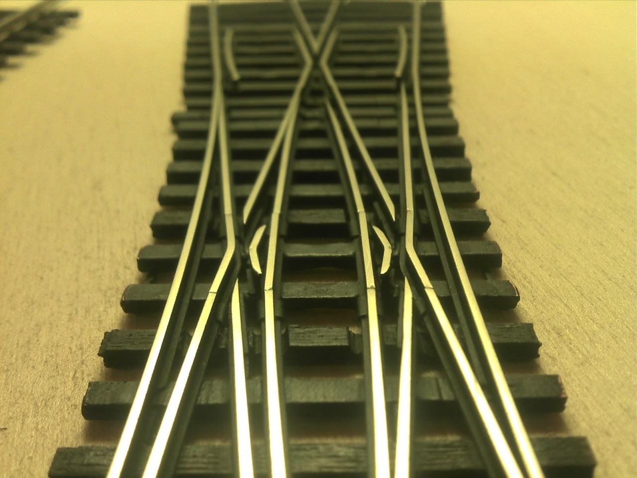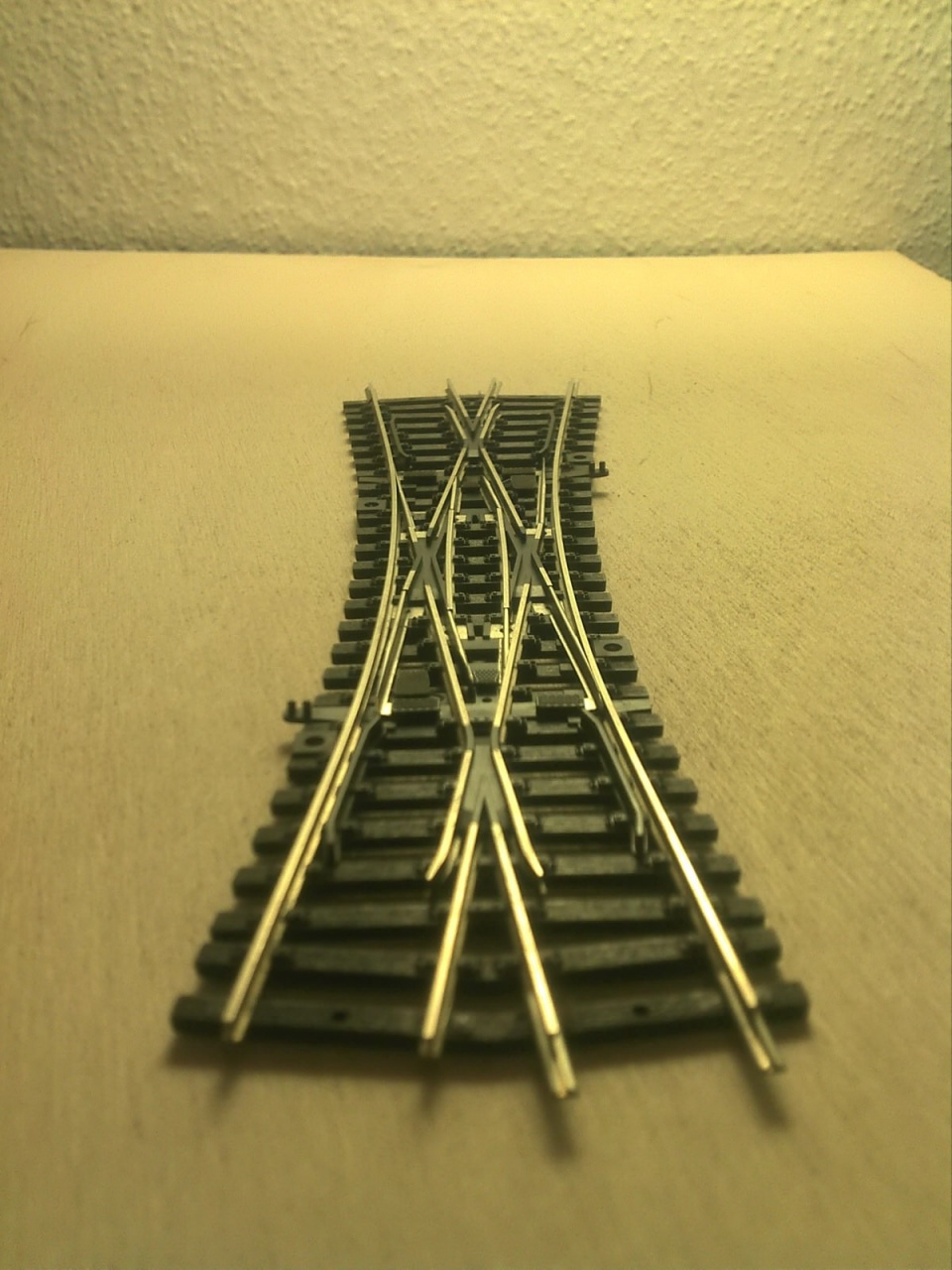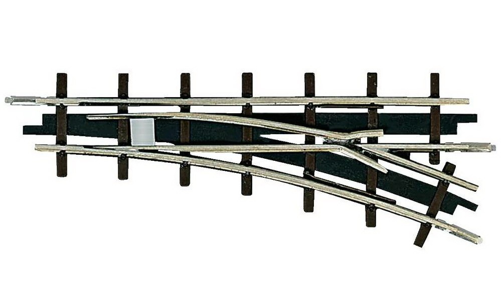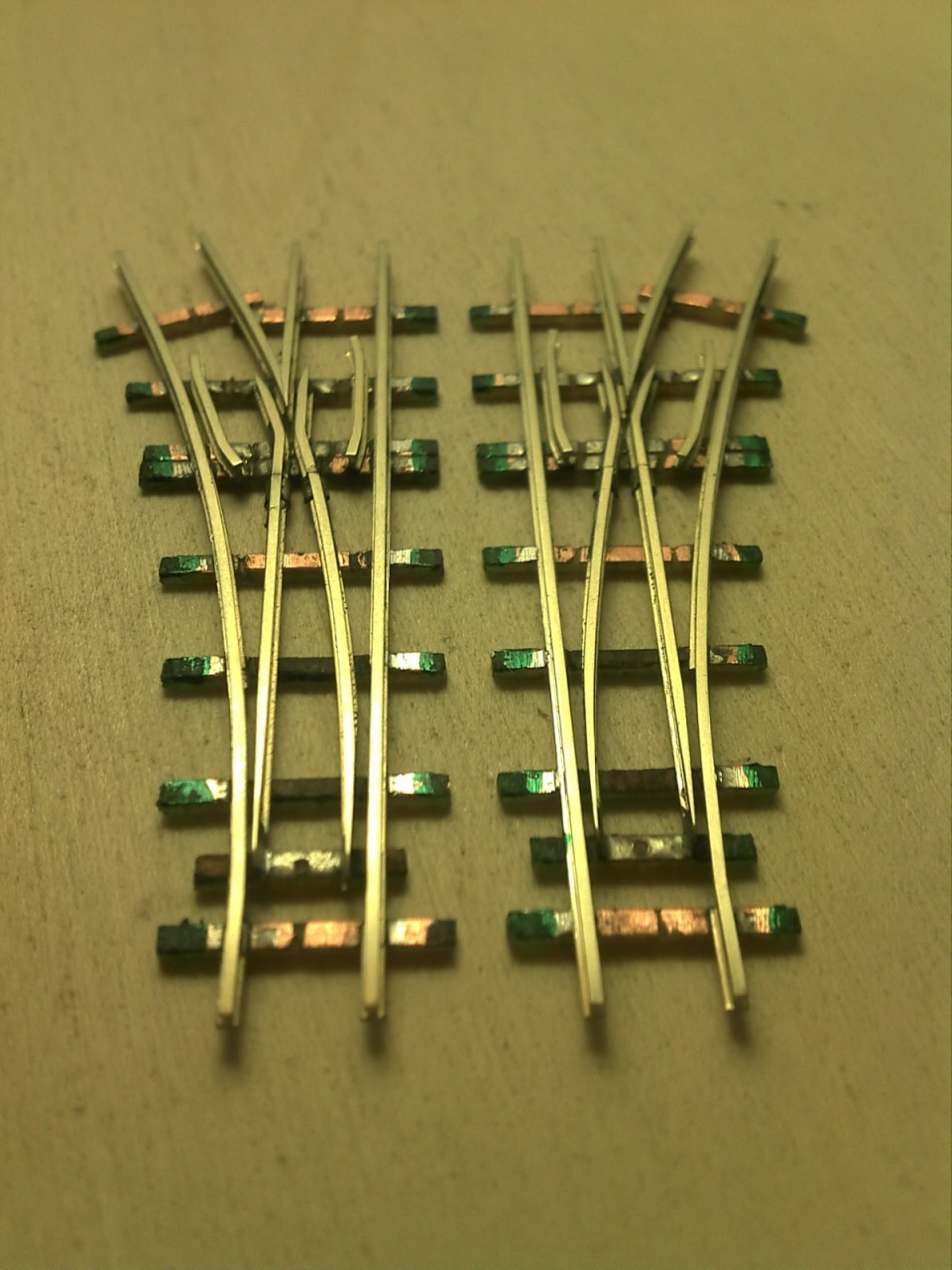 A Busch koppintásnál vettem a fáradtságot, és rendesen megcsináltam a belső vágányt is. A Busch ezt elég érdekesen oldotta meg, mert a kitérő oldali tősín alapján ez egy átmenőköríves kitérő, de a belső sínt simán egyenesen hagyták, és csináltak egy 22,5°-os egyenes keresztezést. Az enyémnél a szívdarab 16°-os, és a végére éri el a 22,5°-ot. |