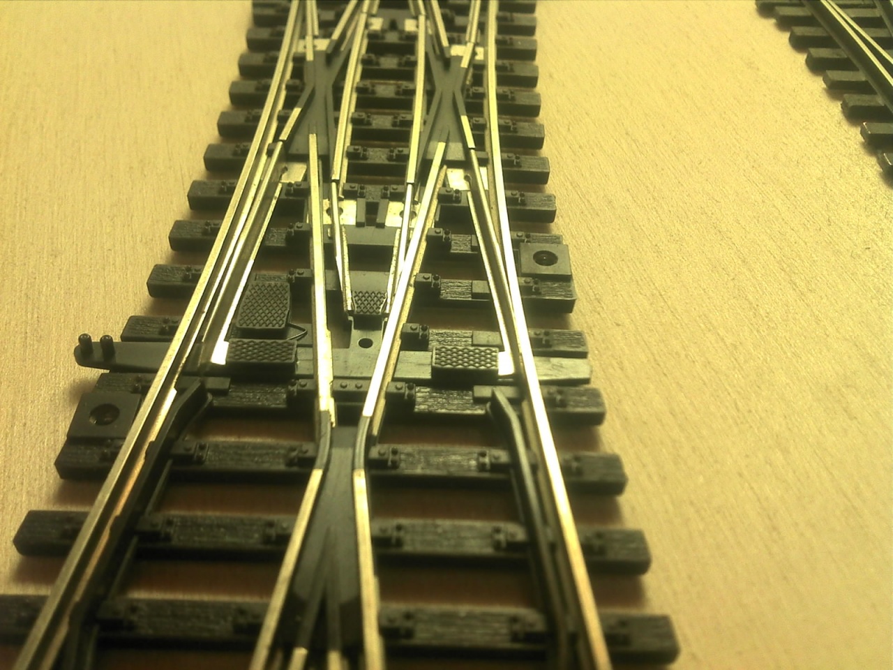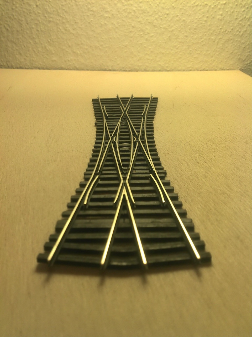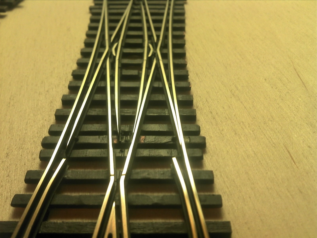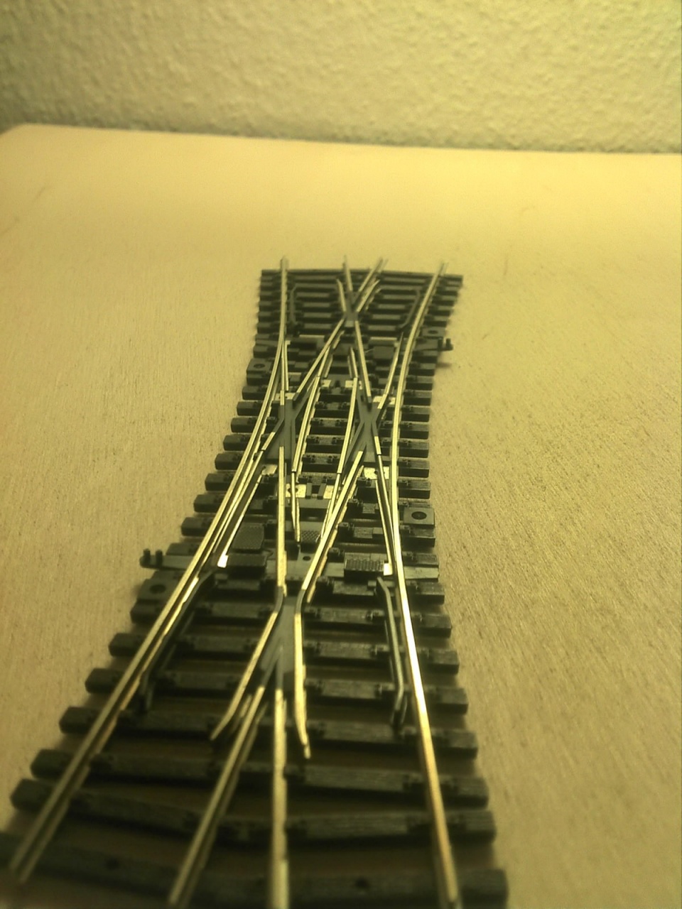 A Busch koppintásnál vettem a fáradtságot, és rendesen megcsináltam a belső vágányt is. A Busch ezt elég érdekesen oldotta meg, mert a kitérő oldali tősín alapján ez egy átmenőköríves kitérő, de a belső sínt simán egyenesen hagyták, és csináltak egy 22,5°-os egyenes keresztezést. Az enyémnél a szívdarab 16°-os, és a végére éri el a 22,5°-ot. |