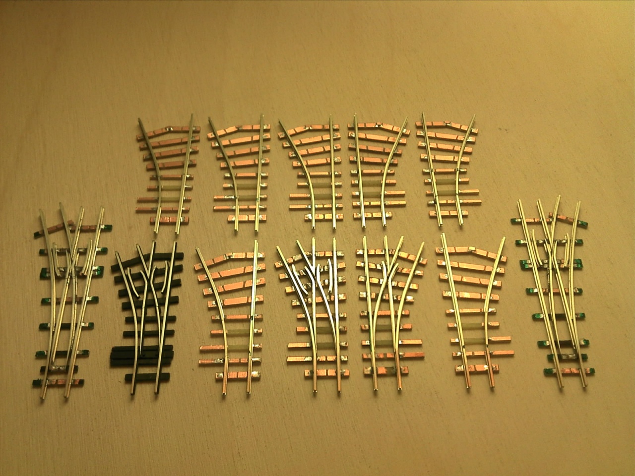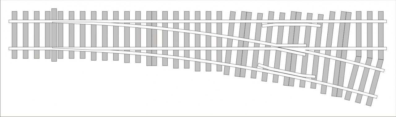 Ez egy PIKO 15°-os kitérő, "MÁV" talpfákon, de úgy lett megtervezve, hogy 2,1mm-es profillal ROCO, kicsit rövidebbre vágva TILLIG geometriába is be lehessen illeszteni, sőt akár rövidebb modulra is, mert 57mm-es vágánytengely távolságtól a kitérő ág is egyenes, addig átmenőköríves. Természetesen folyamatos és csuklópontos csúcssínnel, szigetelt és polarizált változatban is el lehet majd készíteni. Hogy a kivitelezése mikor fog megtörténni, azt még nem tudom, de előreláthatólag a nyár közepén.