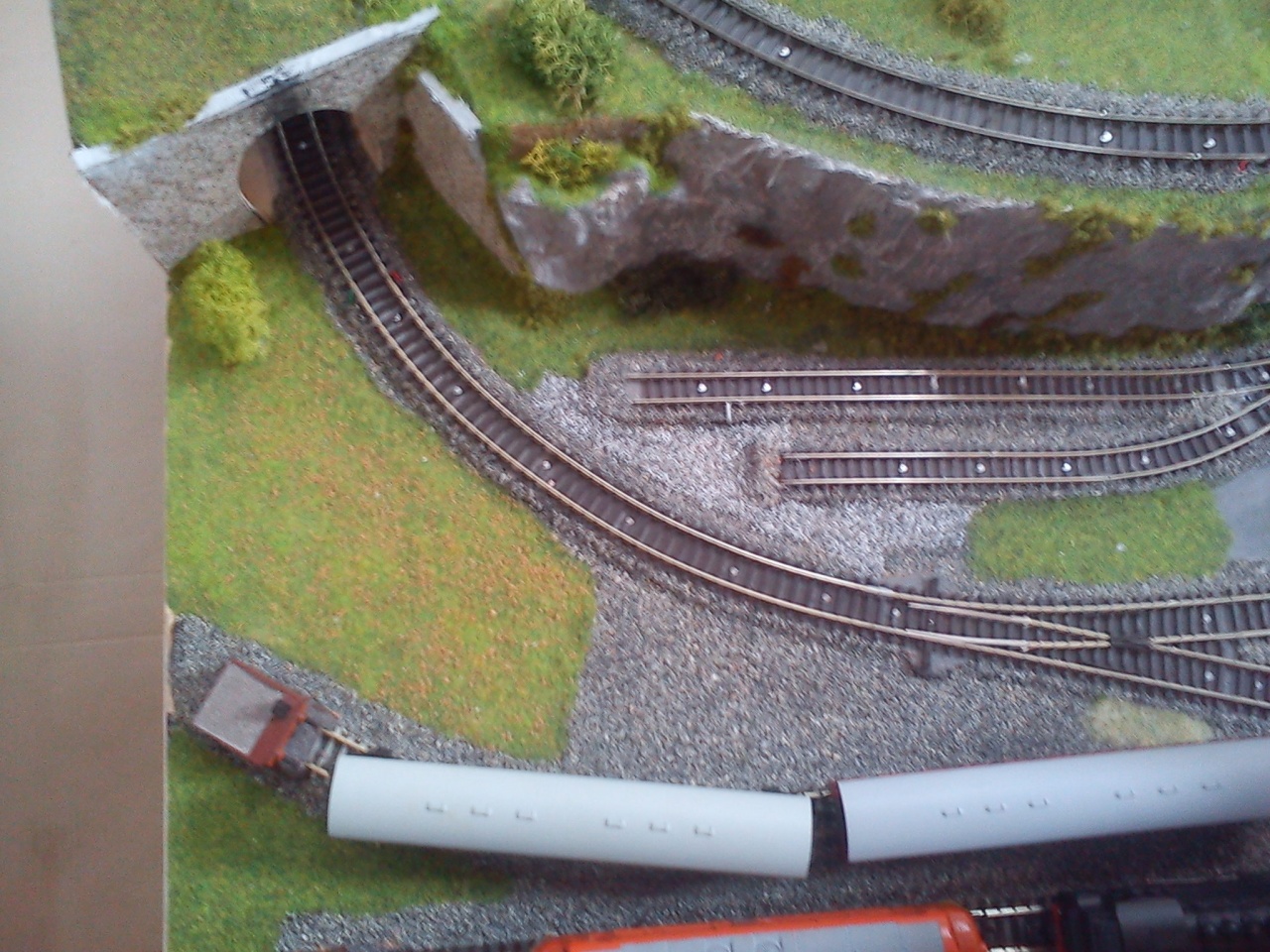 Bocsánat, valóban elfelejtettem leírni, a terv szerint csak a felső (belső vágány, amely előtt a váltó egyenesben van) vágány halad át a "nagy"vasúton a külső (amelyikre kitérőben jár rá a vonat) az rakodó marad.