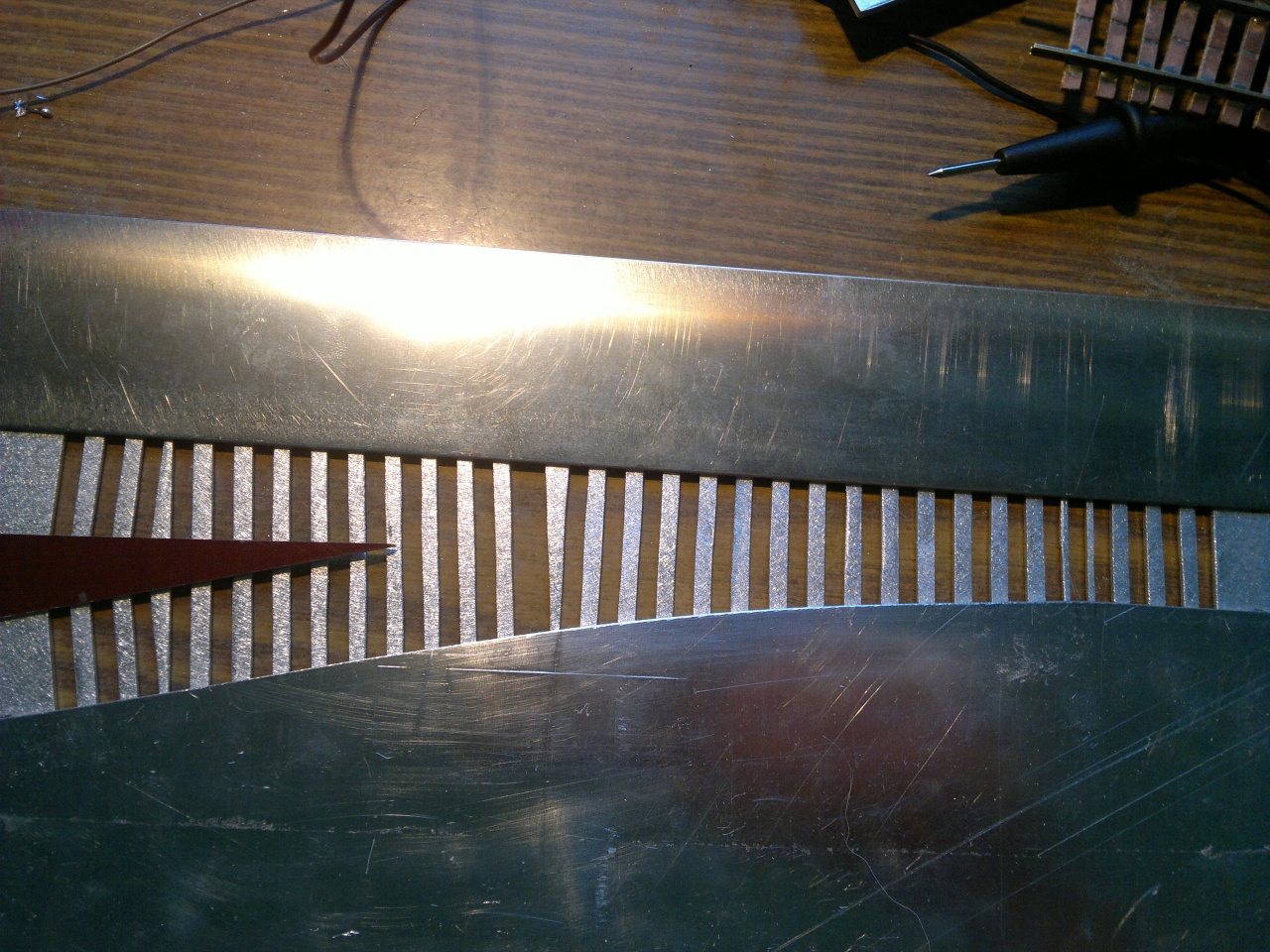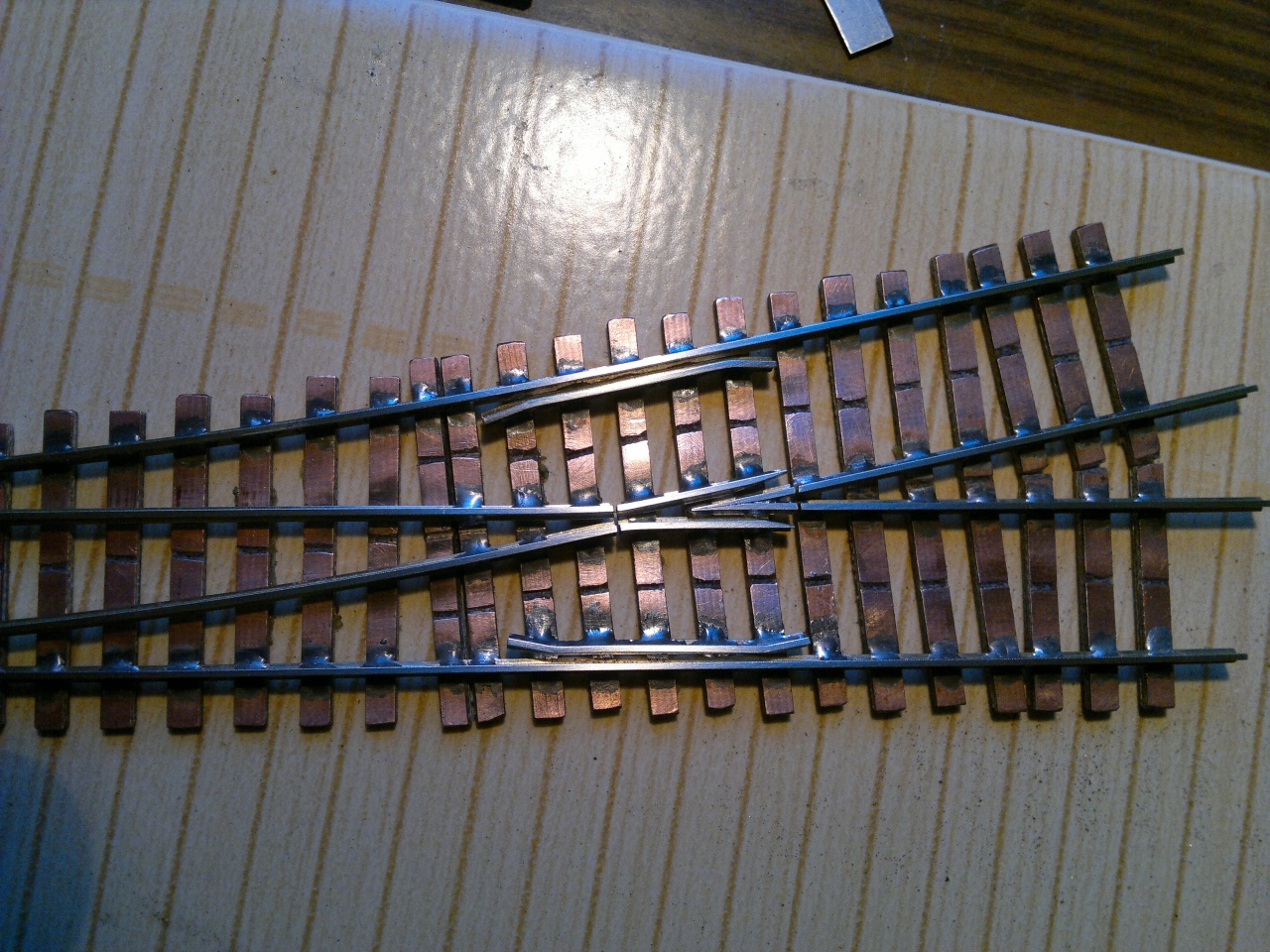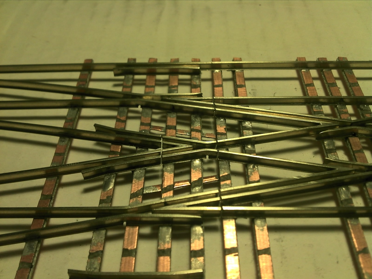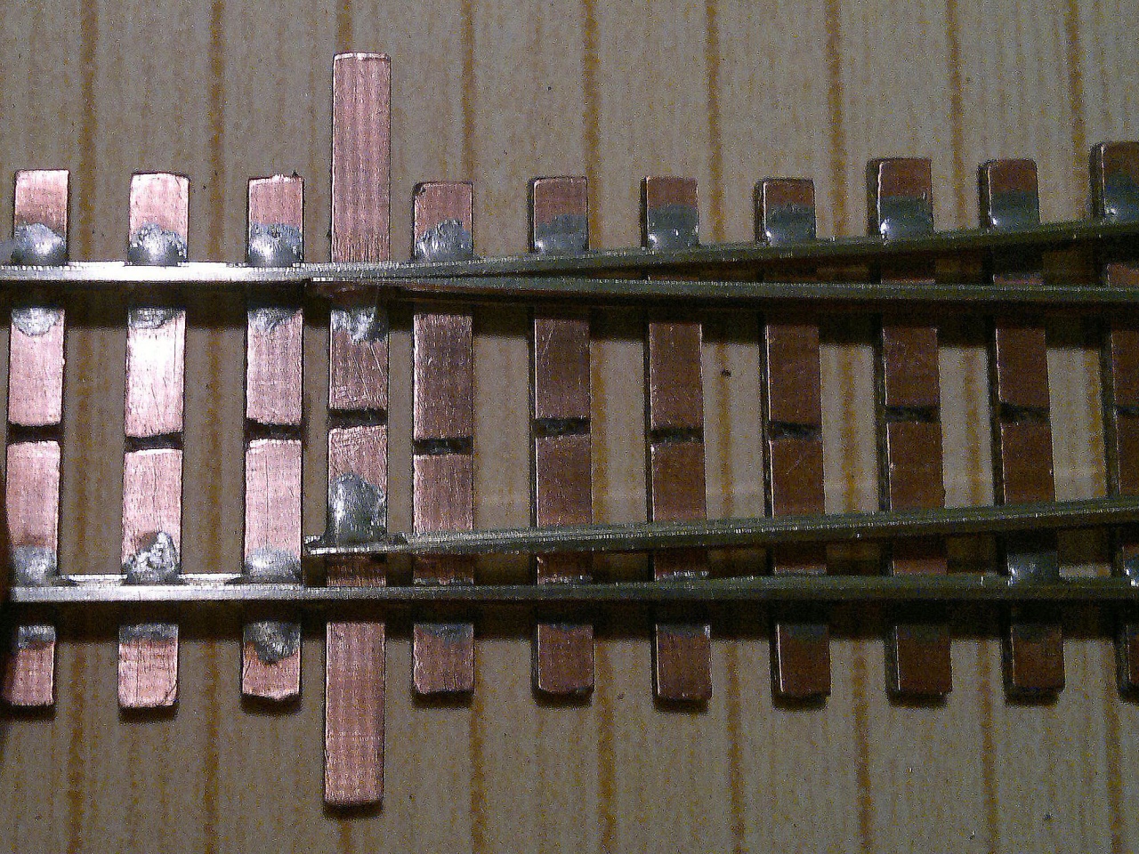 Tán annyit jegyeznék meg, hogy próbálj meg egy kicsit kevesebb cint adagolni, hogy ne legyenek ilyen nagy göbök a sín talpánál, és a szigetelő vágásnak nem kell ilyen mélynek lenni. Elég épp csak a réz réteget átvágni.