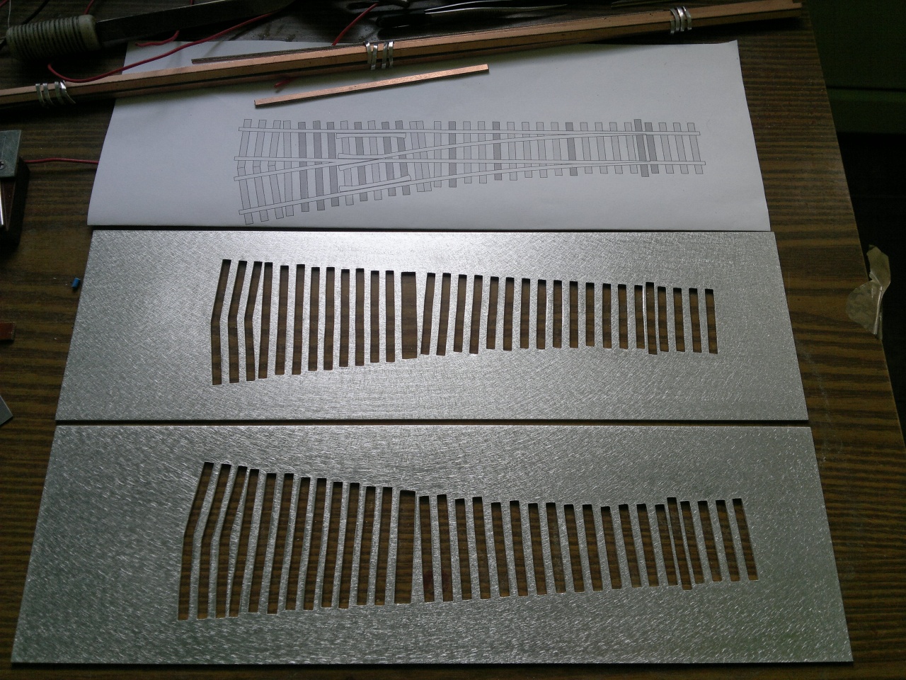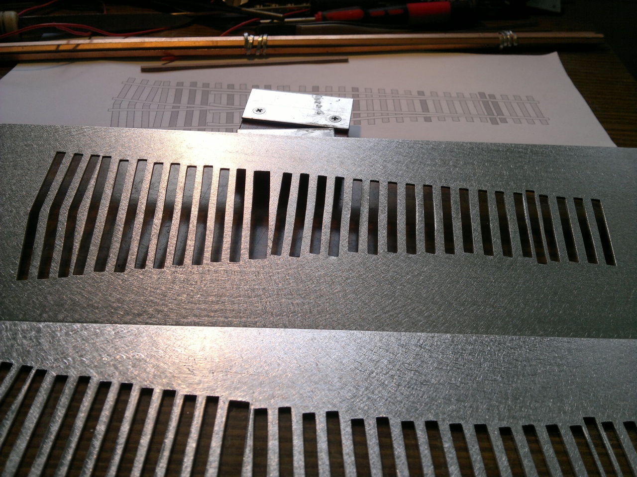 Nagyon ügyes sablon! Azt meg talán mondanom se kell, hogy pont a talpfás vágány és kitérő az, ahol nem feltétlenül szükséges a századmilliméteres pontosság, mivel az igazi szerkezet sem követeli ezt meg (a talpfán ugye bárhova lehet lyukat fúrni).