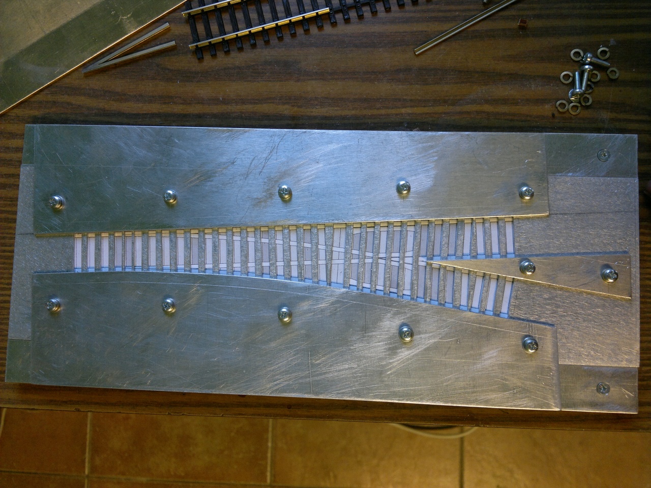 Vágj 3mm-es csíkokat az alulemezből, tedd be a kész váltódat a sablonba, és valami jobbféle pillanatragasztóval minden második közbe ragassz egy kis lemezdarabot, amit nekitolsz a sín talpának kívülről vagy belülről, ahogy elfér. Hagyj egy minimális játékot, és van egy tökéletes sablonod. Hátrány, hogy külön kell jobbos és balos, de úgy láttam, a talpakat már megcsináltad! |