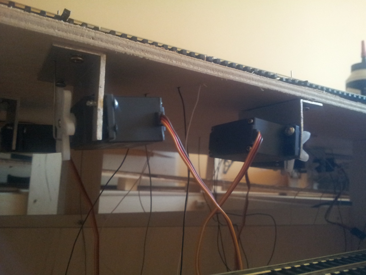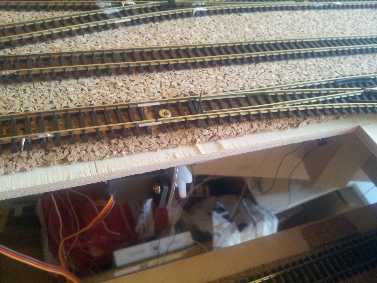 Én ezt a váltóállító és tartó szerkezetet építettem meg. Erőkar itt is van, bár a motor 3,8kg/cm nyomatéka elég majdnem bármihez egy vasúti asztalon. Az acélhuzal 0.8mm-es, ez éppen átfér a Tillig váltók nyílásán. |