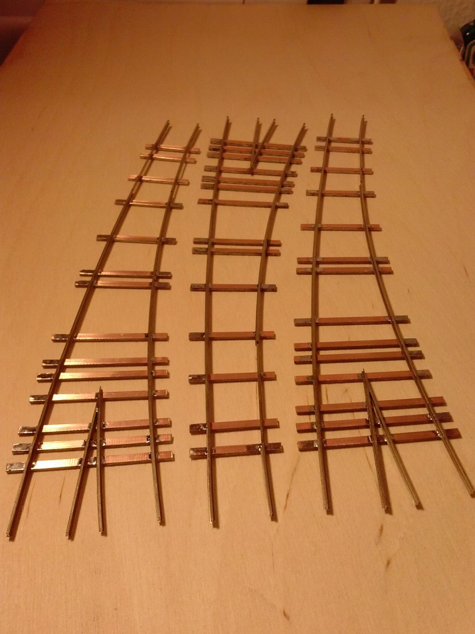 Amíg a kis TT háromutas kitérő, és a Fugi hózentróger festés után szárad, elkezdtem három H0 íves kitérőt. Ezek 605/907mm ívűek, és a szívdarab 9 fokos: |