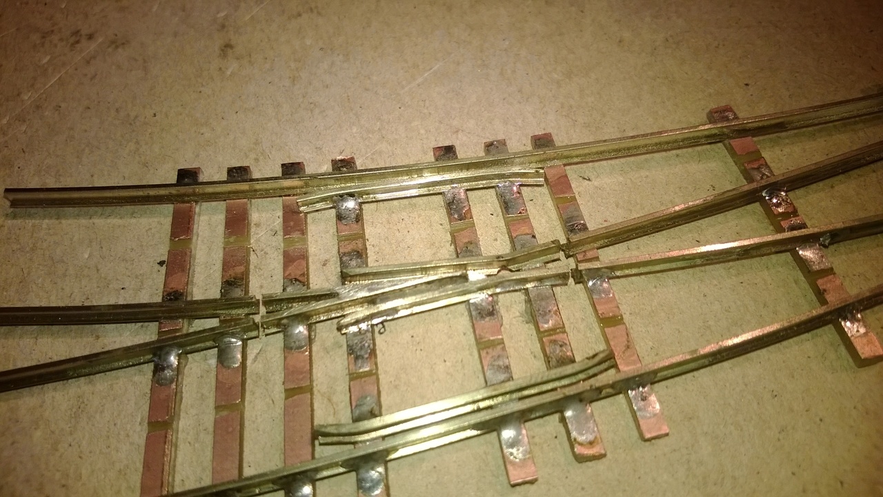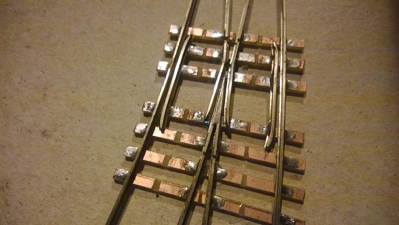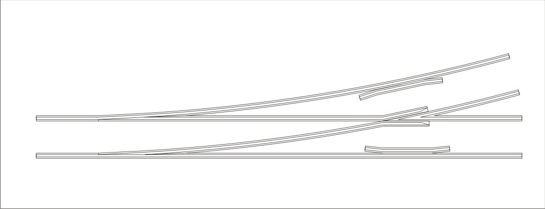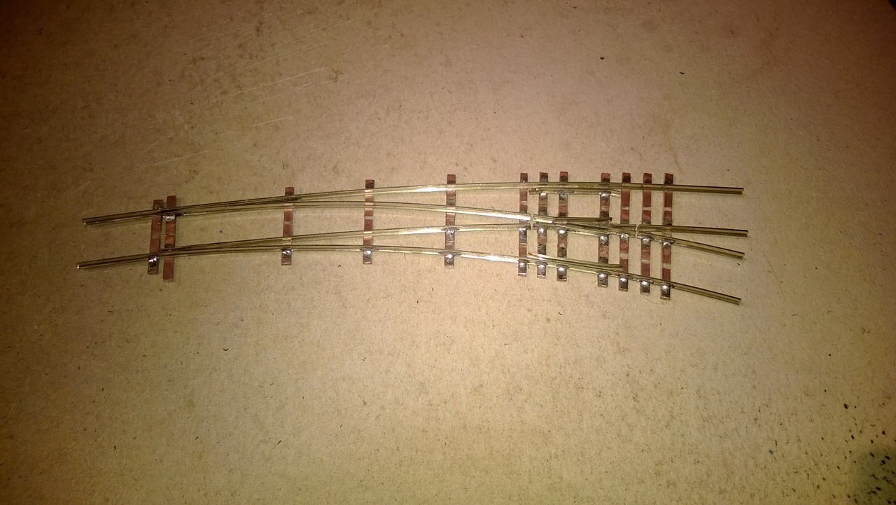 A középső képen nézve bal oldali könyöksín sz.tem túl közel van a csúcshoz, mert ha jól látom összeér a sínek talpa. A vezetősín-könyöksín külső távolság 14-14,1mm, és a könyöksín-csúcs távolság 1,1-1,3mm. Ez azért kell, mert pl. egy kéttengelyes kocsi kereke ekkora ívben elég nagy szöget zár be a sínnel, és ha nem elég nagy a hézag a csúcs és a könyöksín között, akkor befeszül a kerék (ezért nem elég csak forgózsámollyal tesztelni).