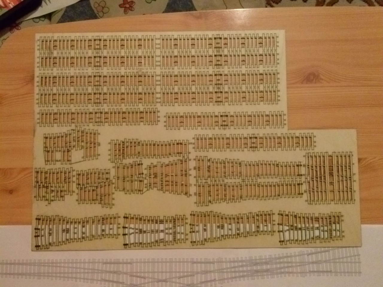 Így néz ki 2,7m H0-H0e egyenes vágány, egy jobbos egyenes fonódás, egy balos íves fonódás, egy 15 fokos balos kitérő ahol a H0 tér ki, valamint 10 fokos Roco geometriába illeszthető hármas, bázeli és egy két angolváltós hózentróger talpfája....  |