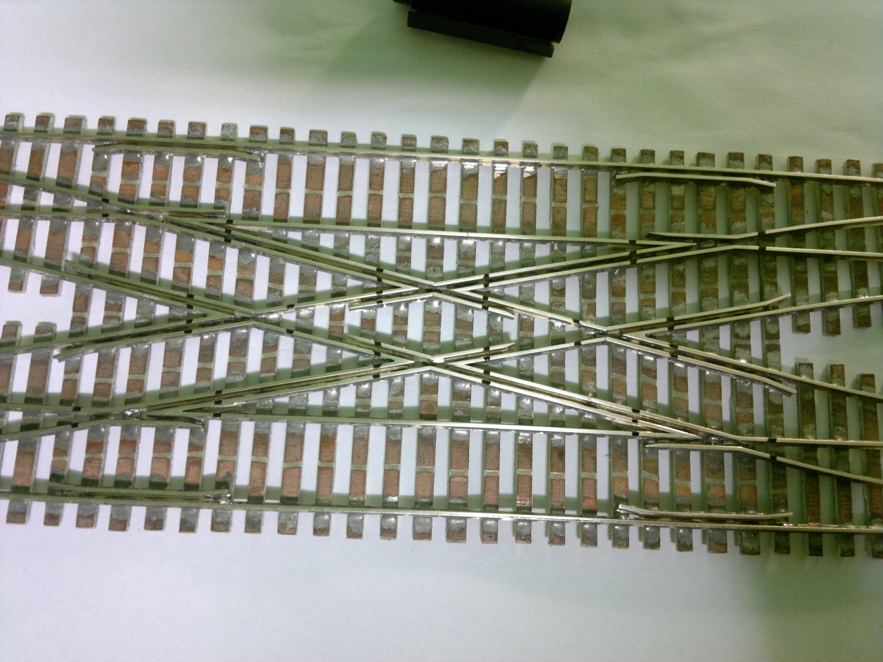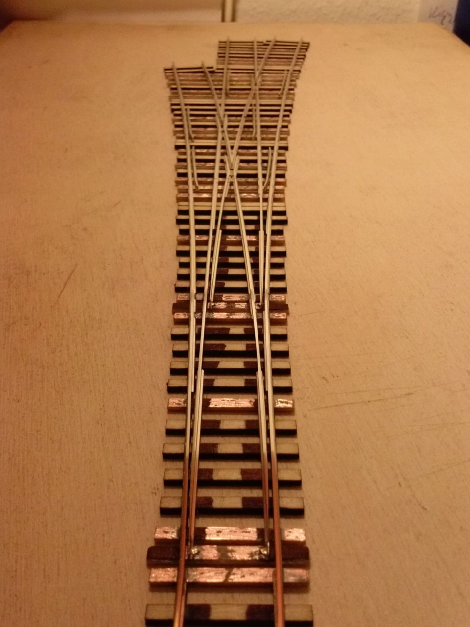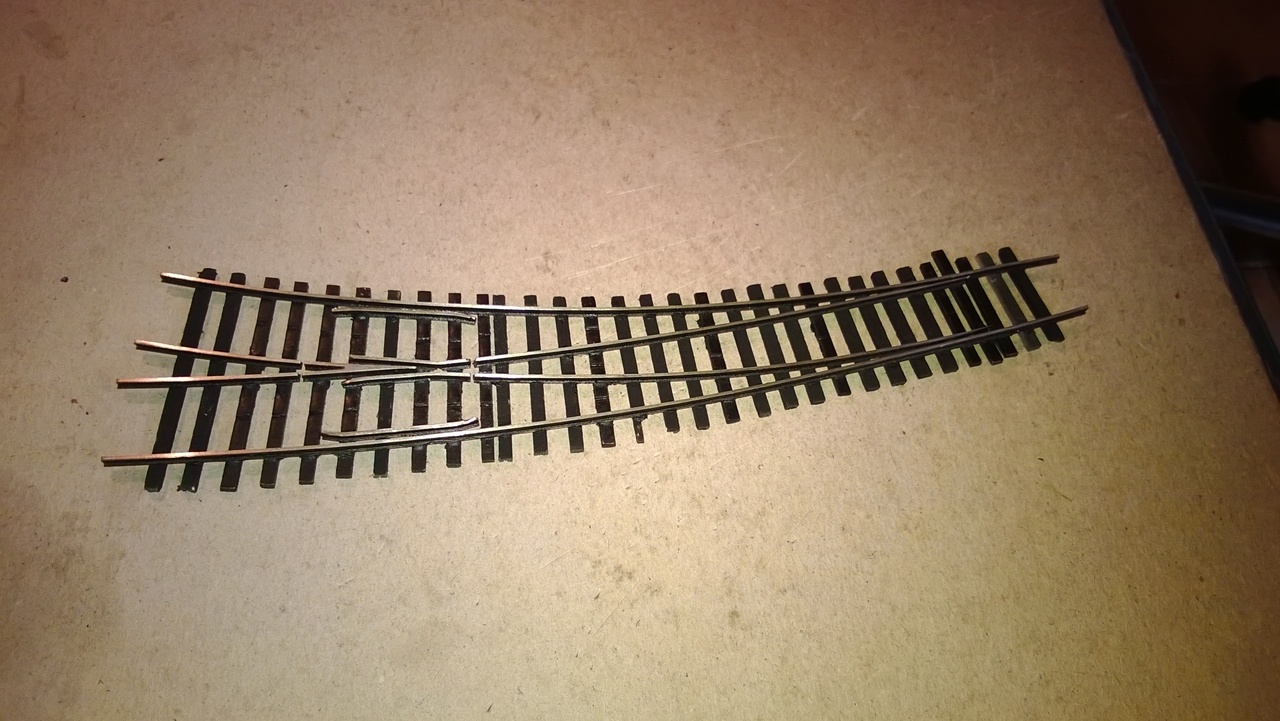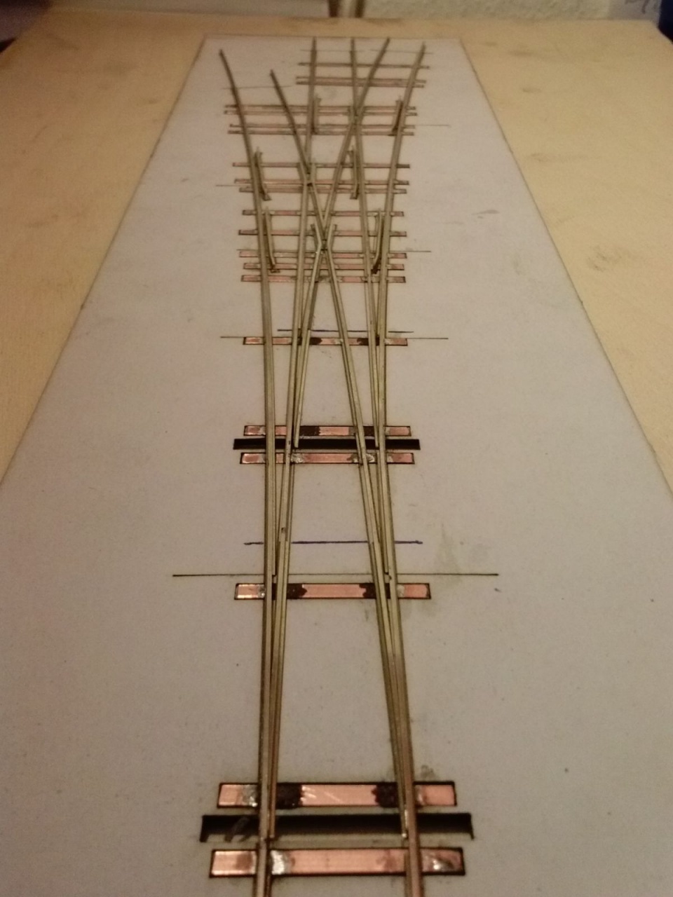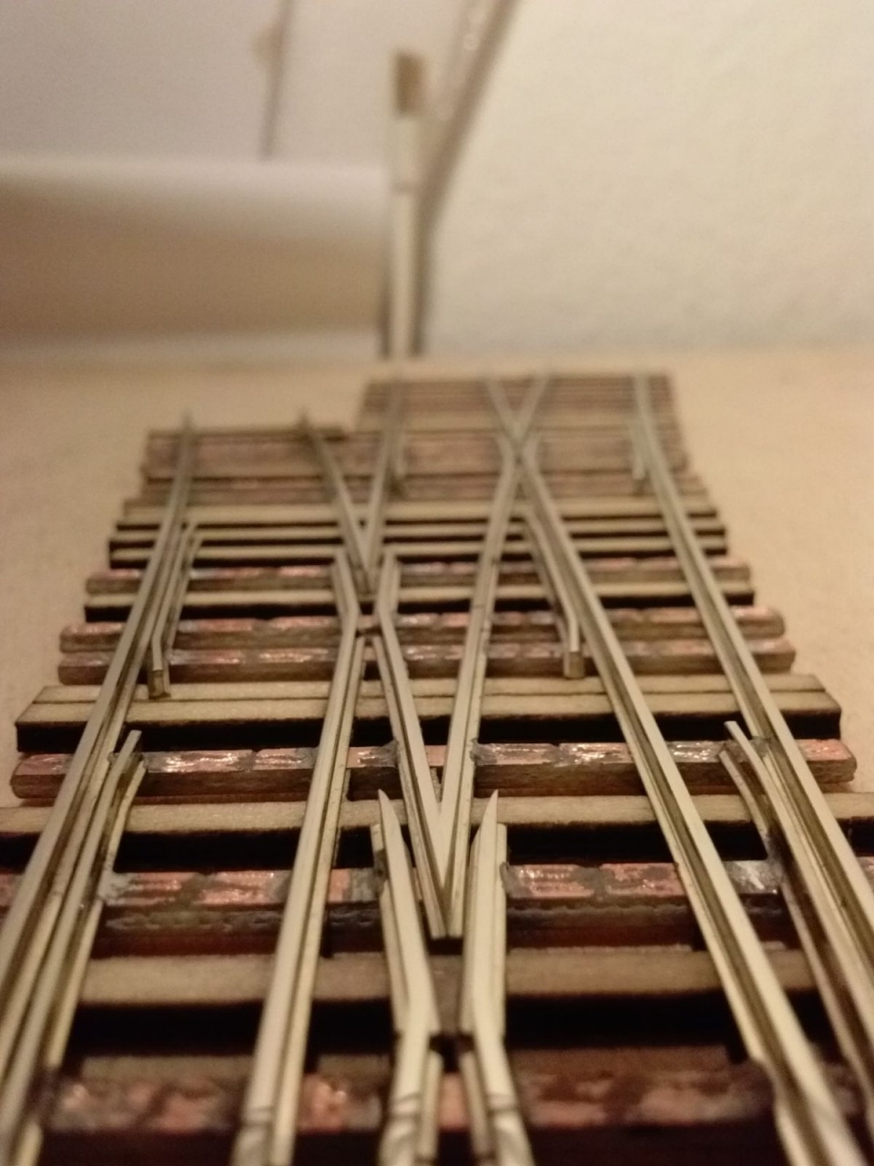 Újabb gödöllői project, ROCO 10 fokos geometriájú hózentróger két angolváltóval. A hármas kitérőt még Tillig 2,07-es profilból építettem, de szerencsére megérkeztek a PECO IL-115-ös profilok, amelyek a legjobban hasonlítanak a ROCO igen amorf sínszálaihoz. A talpa ennek is keskenyebb, mint a ROCO-é kb. 0,2mm-rel, de legalább a sínkorona szélessége megegyezik, és a magasságbeli eltérés 0,03mm, ami ebben a léptékben is a semmivel egyenlő. |